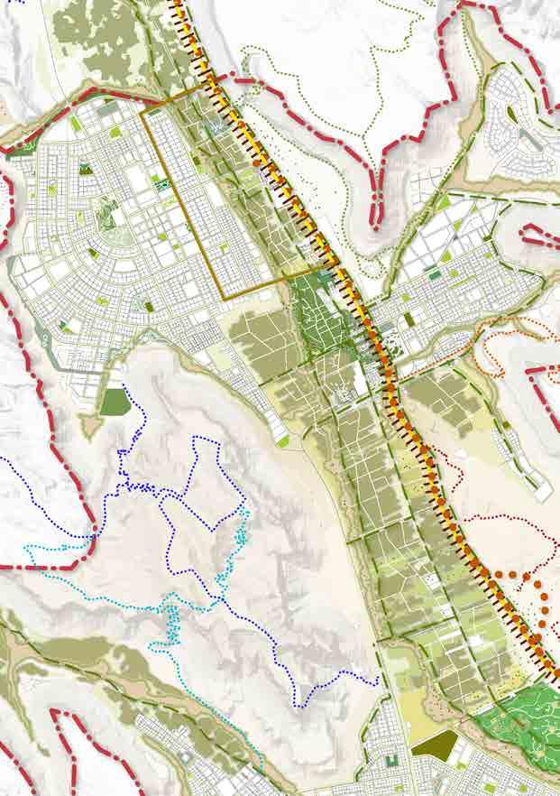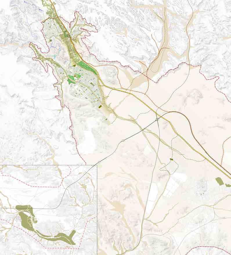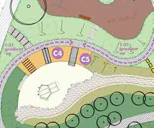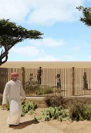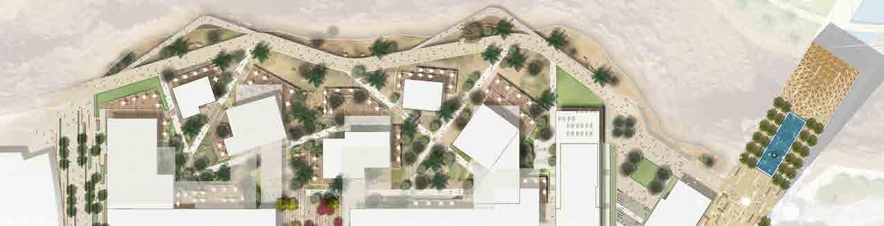 Scenic wadi views alongside pathway and resting platforms. To create levels differences by buildings, decks, plantings, and paving.