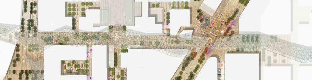 Shaded structure to provide resting and cooling environment for local people, branched pathway lead people to various experiences
