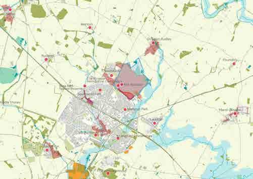 set within woodland and heathland context, including community hub, school, care facilities, SANG and multiple neighbourhood play spaces.