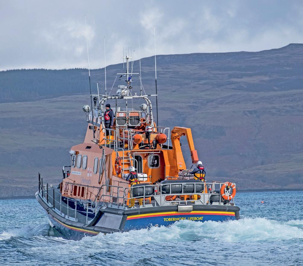 Tobermory RNLI coxswain, David McHaffi e said: “We certainly marked our Severn Class lifeboat’s 20th anniversary with a momentous 36 hours. We would like to thank the fi shing boat who assisted the yacht during our fi rst shout, as well as the crews of the coastguard helicopters from Inverness and Prestwick.All of us at the station send our best wishes to those involved and we hope they have a speedy recovery from their injuries. We were also pleased to be able to meet up with Alex and welcome the local Coll children on board.”