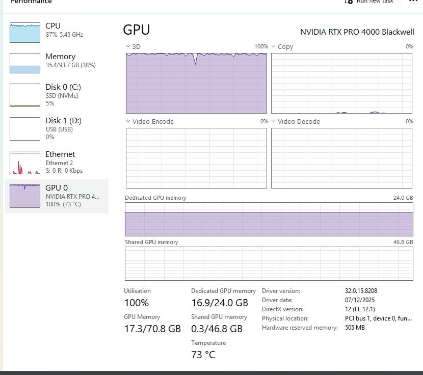 With 96 GB of VRAM to play with we wanted to see just how far the RTX Pro 6000 Blackwell could be pushed. Rather than focusing on a single massive task — such as fine-tuning an LLM or generating high-resolution AI imagery — we set out to discover how many simultaneous workloads it could handle, before throwing in the towel.