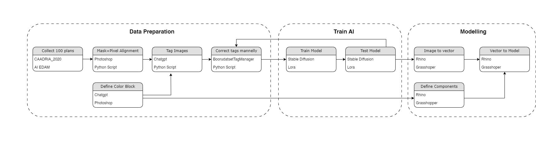 The project utilizes the latest image generation model, Stable Diffusion, combined with Lora for training to achieve controlled floor plan generation. The process also incorporates ChatGPT, Python, and Grasshopper to assist in data processing, accelerating the workflow. This enables the automated design process for singlefamily homes.