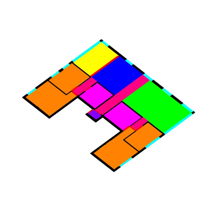 For generating the second floor plan, a method involves using masks to fix the vertical spaces, circulation areas, and bathrooms. After regeneration, unreasonable plans are filtered out using a label reading program. This provides greater freedom and speed for blocks of different shapes.