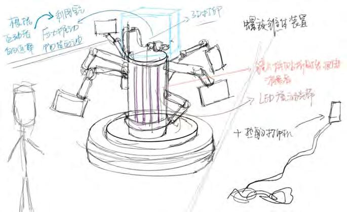 This sketch shows a rotating central structure with multiple robotic arms holding screens to create a 360-degree immersive display, connected to a thermal printer. The structure is overly complex, making it difficult to build and potentially causing unstable interaction.