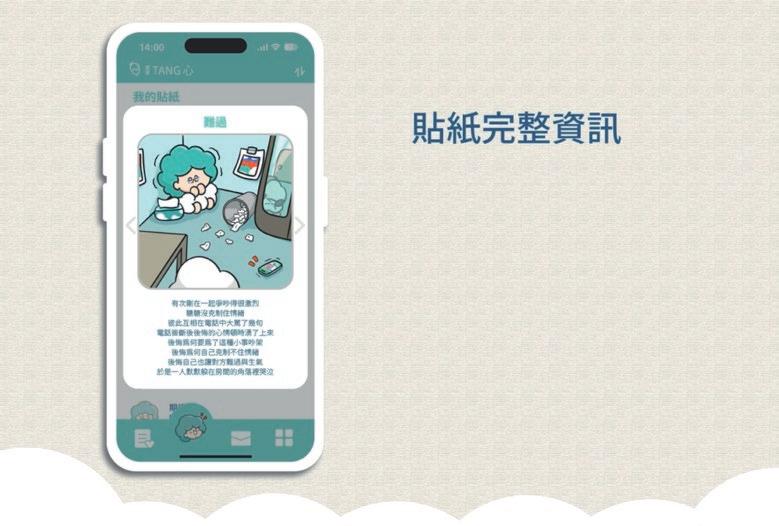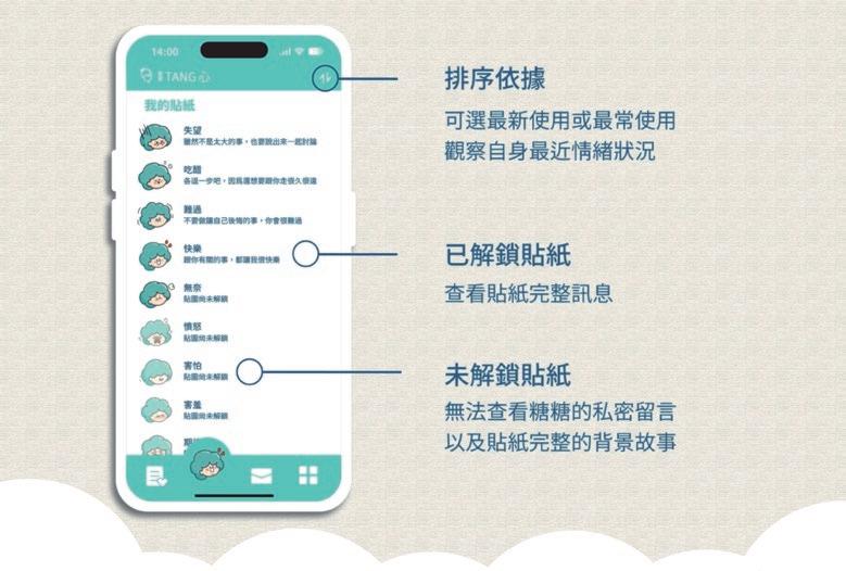 透過解鎖貼紙、情境圖,吸引使用者分析心情指數,並給予對應分數的療癒文字回饋。
