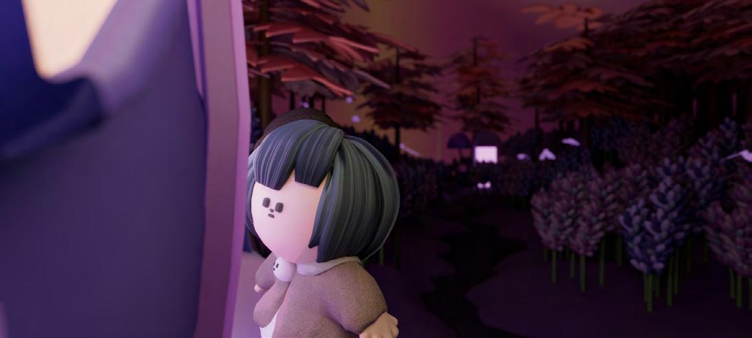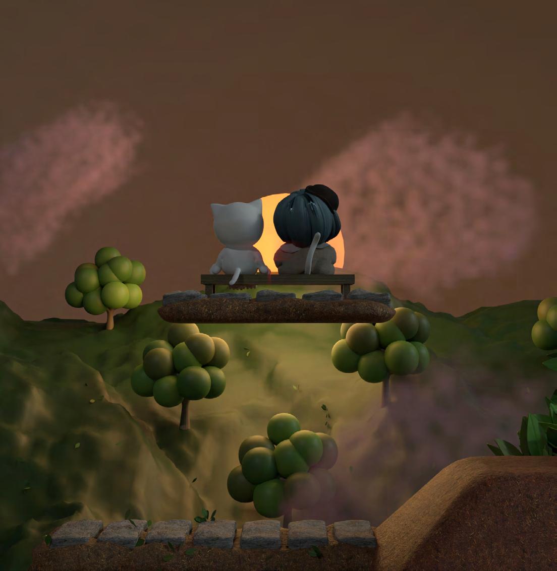 此處希望營造的是一個單純且直觀的快樂,用繽紛且明亮的色彩呈現,使整體世界較為豐 富與活潑。