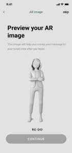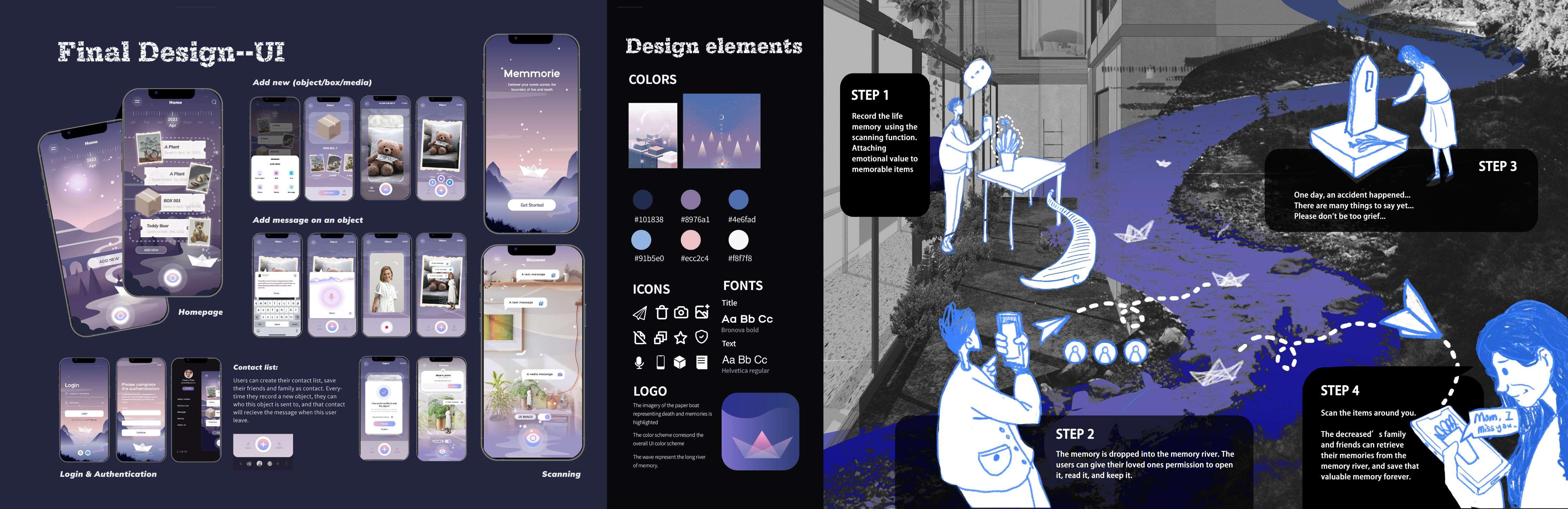 Information Architecture Low-Fidelity prototype Login & Authentication login page Authentication Record AR image Scan the face Users can skip these steps directly and do them later Scan the body and preview the AR image Scan new object Scan the memerial object Scan object You can add AR video, voice and text message on the object Text message Voice message AR video message Take a self-video to convey messagepreview the AR image Message on the object add to object Add new item Community message Answer unlock question Object details Users can reply the message Family scanning the object Scanning the objects that contain public message, users can read the message from the strangers in the community Publish or private To nish adding an object, users need to choose whether make this object private or public. Private: only the contact can reed the message Public: everyone in the community can scan and read the message Adding box Uploading media Take uploading photo as an example. Message on the photo Recieving new items Homepage Decide who send this item to Decide whether to put it in a box