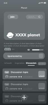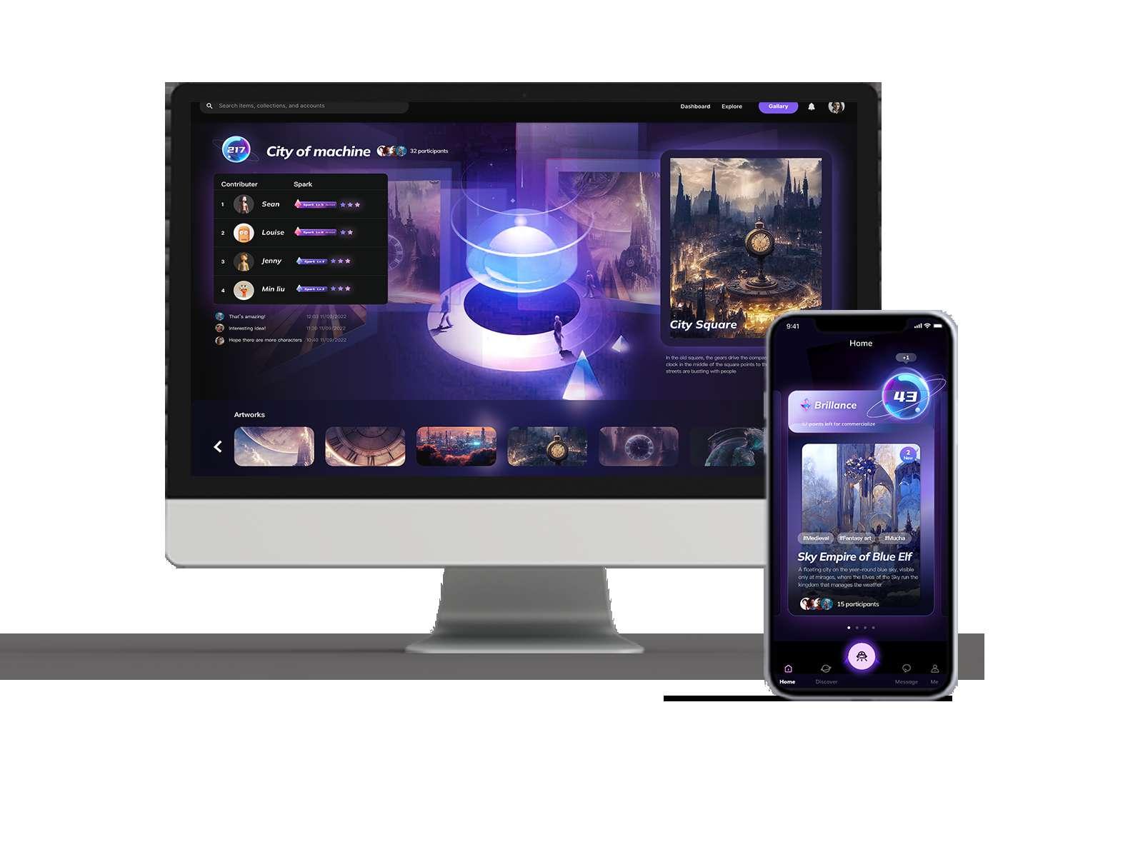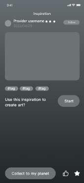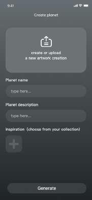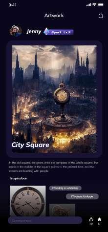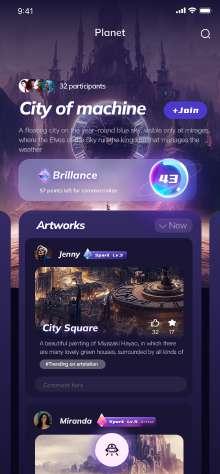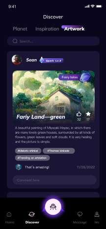 artworks in planet Brilliance reaches Browse the planets created by others, recommend based on user preference tags Participate in discussions in the planet, comment and like other's artworks, increase spark and brilliance to him and the planet Browse artworks, Like or comment it to increase the brilliance of that planet and spark of creator. Artist original artwork Upload your inspirations and collect others As you explore, you can join to participate in the creation process As more and creation, eventually