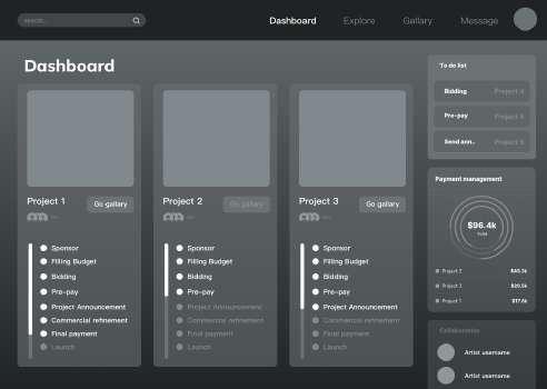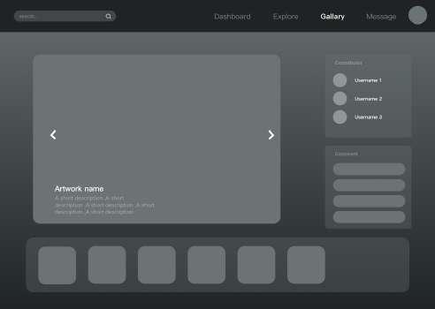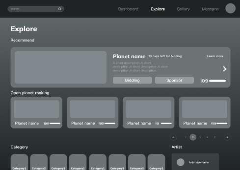 Homepage Wireframe Wireframe Add new Discover Message Me Planet/artwork/inspiration info Dashboard Explore Gallary Create new planet, artwork and inspirations Browse other’s planet, inspirations and artworks between the planet I created and I joined Switch between the planet I created and I joined Revenue Click on the progress item and go to the secondary page for processing Users can manage interactive messages, business income and previous creations Budget paid by the company Art creators (Public and artist) 38% Inspiration contributors 10% Interaction participant 6% AI engine developer 20% Artist tagged (copyright) 20% Service fee 6%
