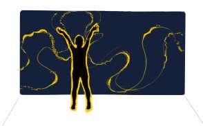 The human body controls the pitch of a track with the right hand and the pitch of a track with the left hand. The higher you lift it upwards, the higher the volume. The horizontal movement of the hands adjusts the tempo of the background track, soothing and slowing down when opening outwards and becoming urgent when leaning inwards. The waveform of the music scene can be made sharp or slow by the external sound values affecting the noise. The higher the external volume. the more rapid the waveform movement.