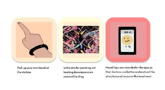 Users receive a wristband at the station, which detects heart rate to perform art healing paintings, while a random painting of the day is displayed outside the station screen, so that passers-by will also be interested in the station and receive the wristband to detect emotions, thus achieving a preventive assessment of psychological problems.