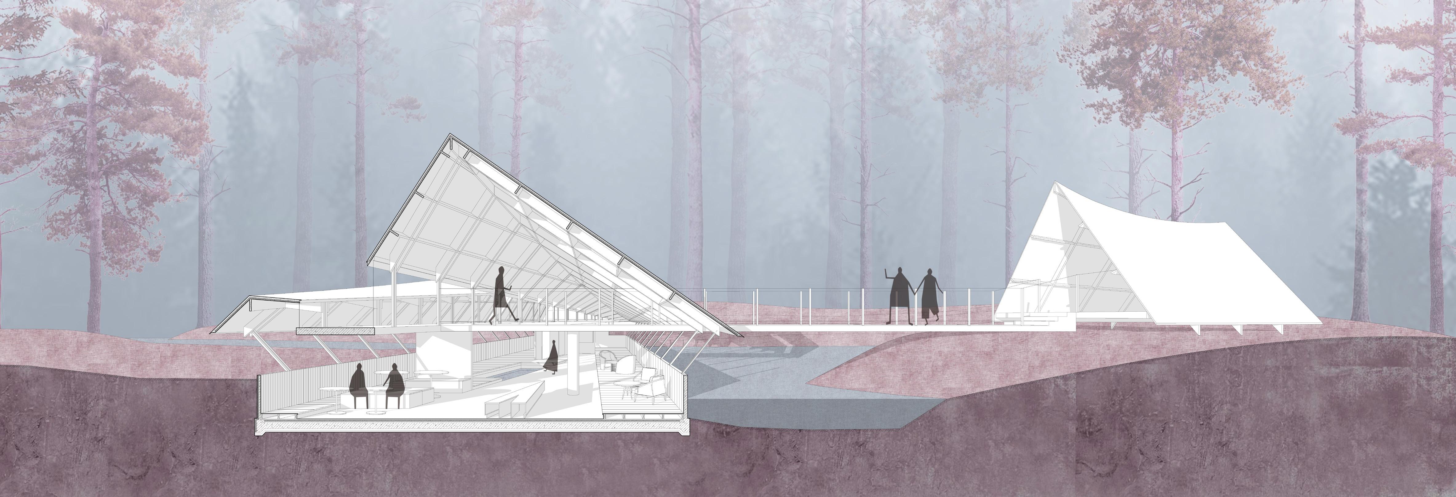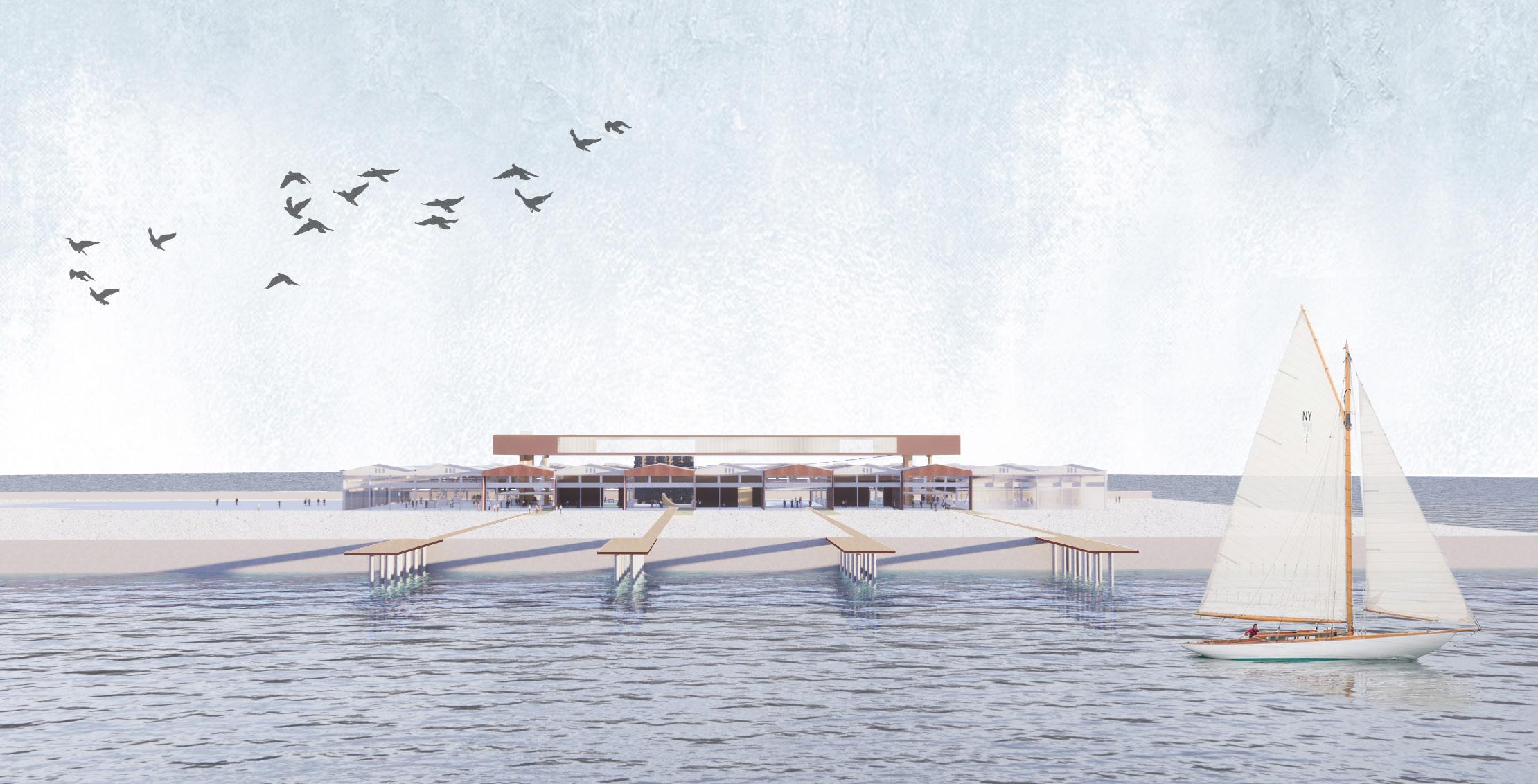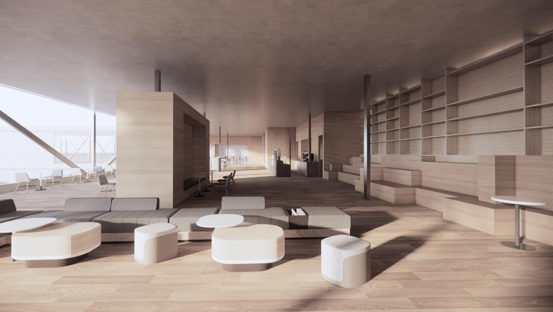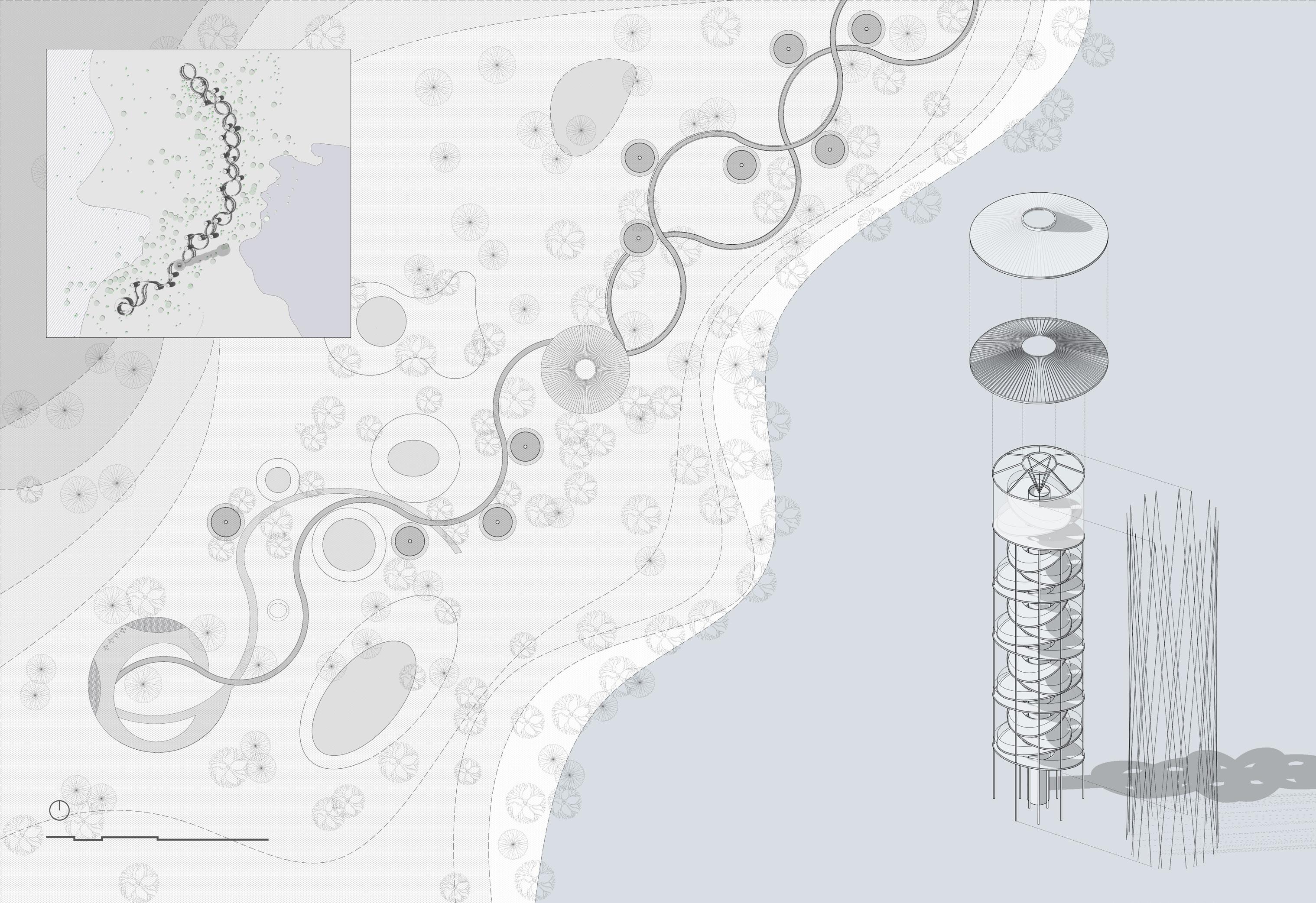 In one section of the trestle, a lookout tower is placed, with a curved section for sightseeing and an enclosed space at the top for monitoring the climate and ecology of the bay, offering the possibility of exploring more activities as well as thinking about ecological design.
