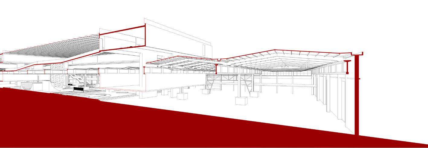 Open part of the roof to serve as an atrium to leave spaces for the new building.