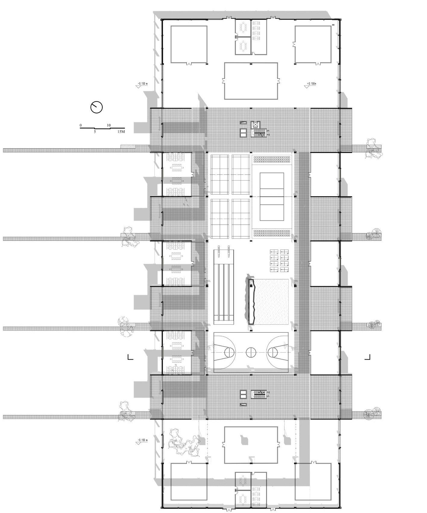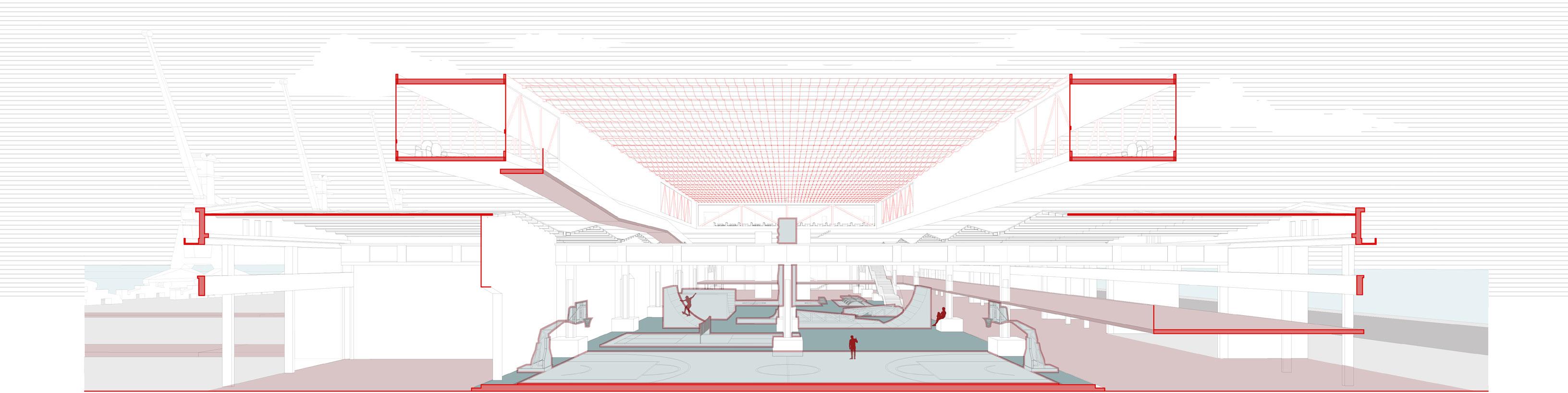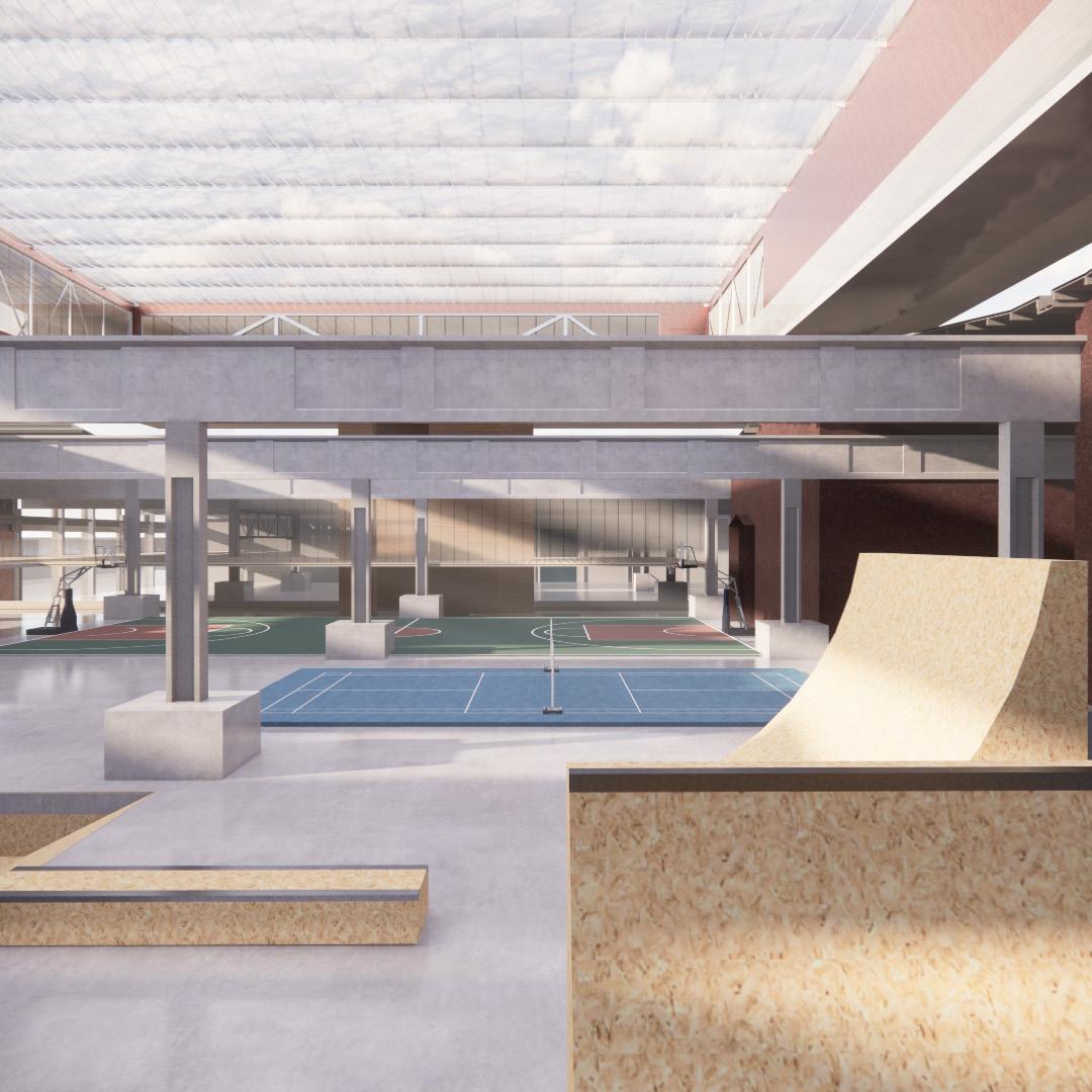 According to the functional properties of the space, and the light and height of the structure, the center of the first floor becomes an open sports field for skateboarding, rock climbing and other sports programs.