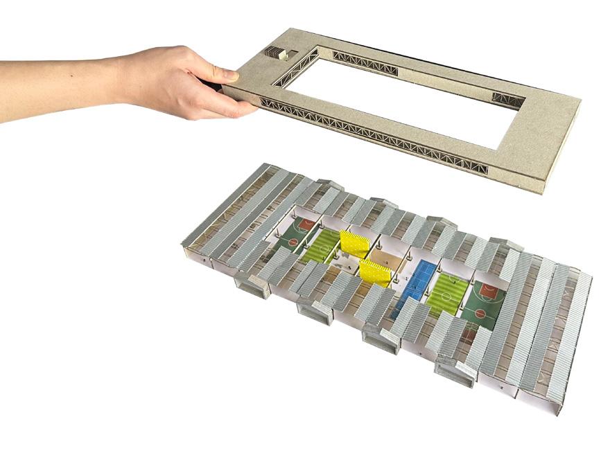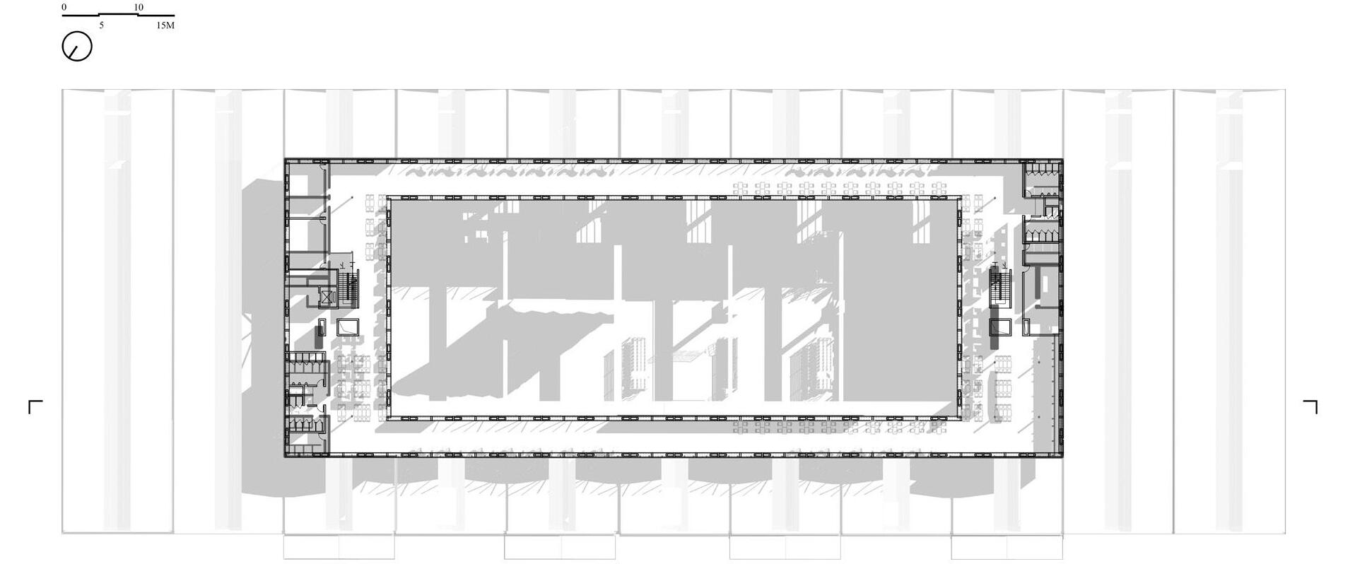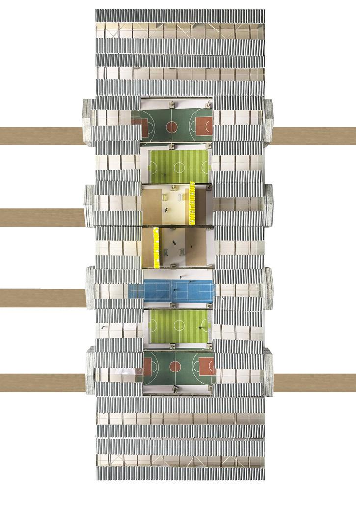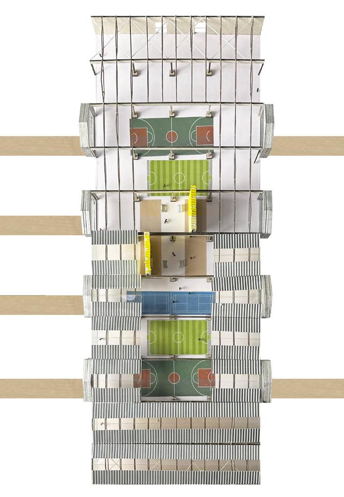 According to the functional properties of the space, and the light and height of the structure, the center of the first floor becomes an open sports field for skateboarding, rock climbing and other sports programs.