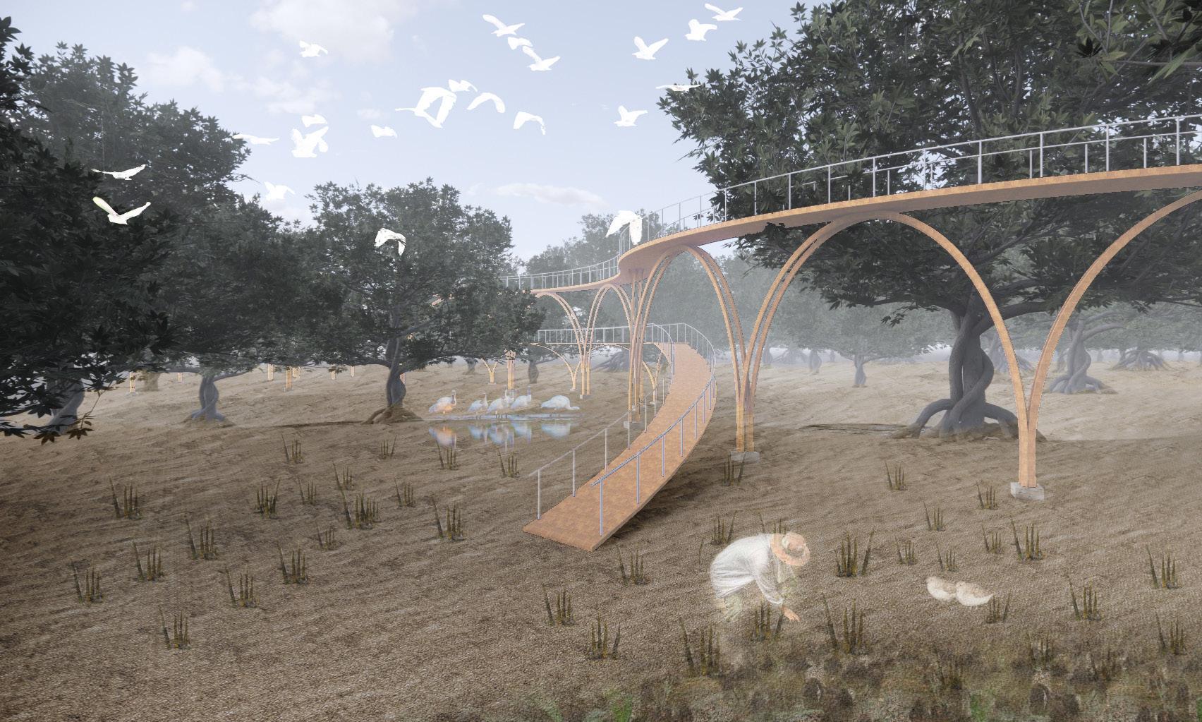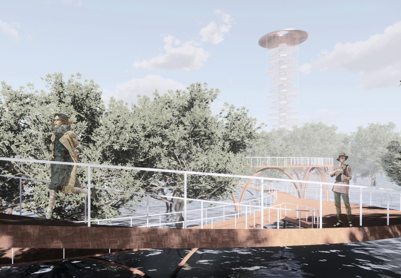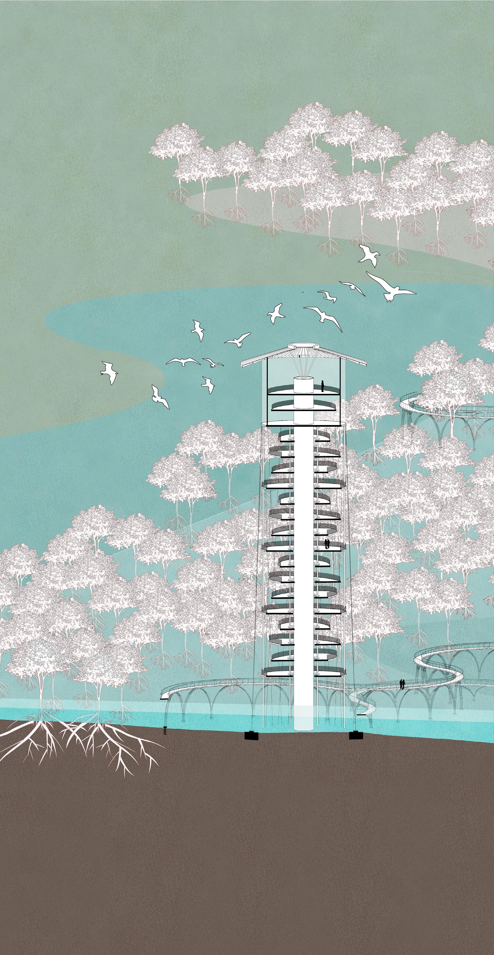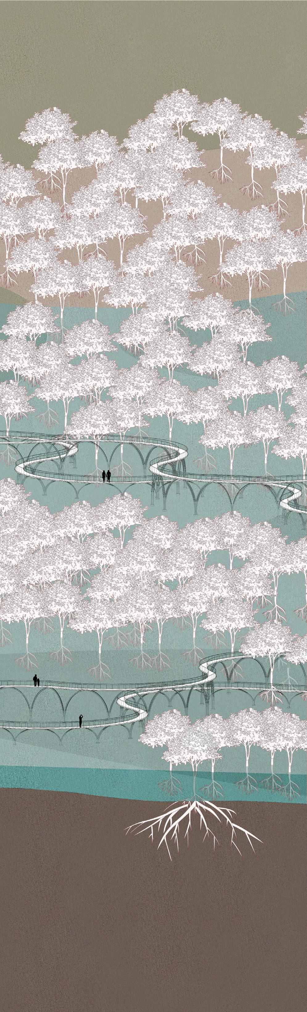 The intersecting, undulating trestles as a spatial organisation system, together with the lookout tower, to enhance the accessibility of the area and improve the tourism benefits of the mangrove nature reserve. On the one hand, it provides different heights and spatial types at the vertical level to meet the needs of ecological and crowd activities, on the other hand it can better integrate into the layout of the local natural environment and reduce the impact on the natural environment.