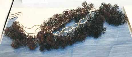 Connecting the two shores with an arc. Change the arc to a curve to bypass the natural distribution of mangroves and add interest to the viewing route.