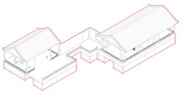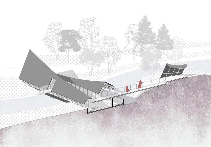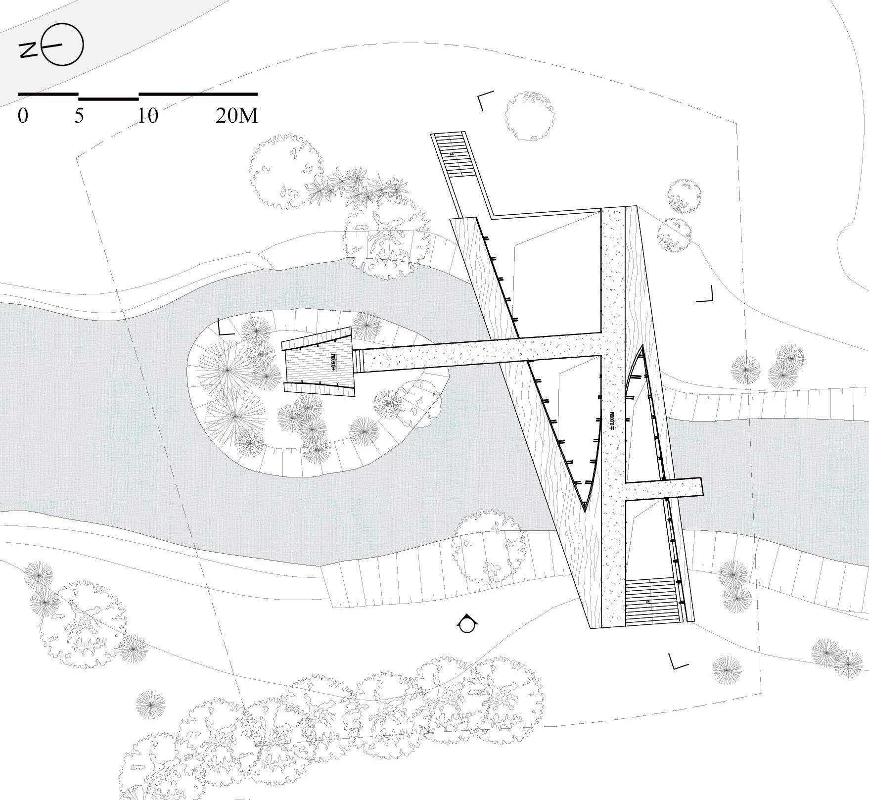The plot is located over a small river. The concept of the design is to not only build a bridge to connect both sides of the banks, but also establish a house in the river. Therefore, "Bridge" + "house" turns out to be the key point of the design. The design is inspired by the poetic traditional architecture from Chinese painting. Its roof with a unique slope is what fascinates me about this project.