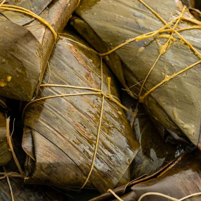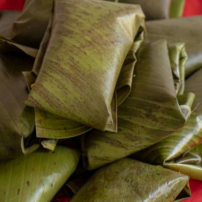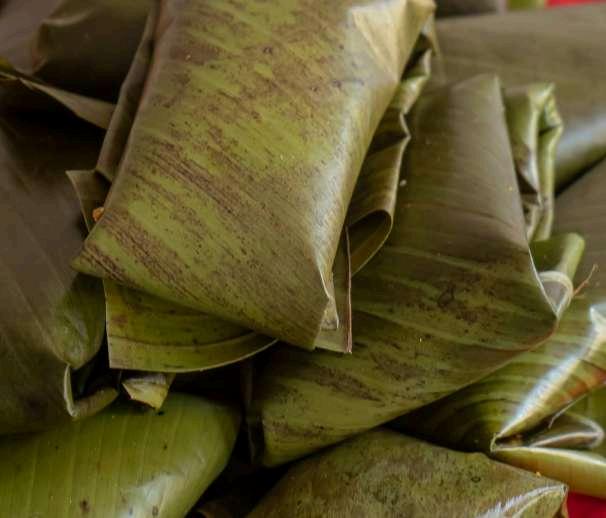 • En hojas de plátano (previamente pasadas por el fuego o agua caliente)