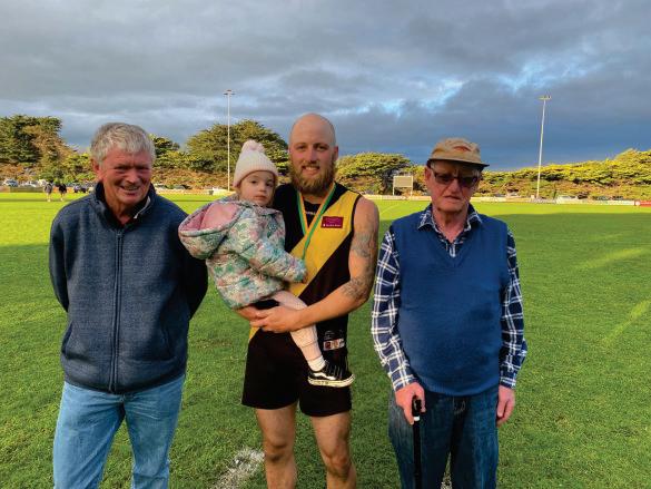 BELOW: Winner of the Private John Rogers Anzac Day Medal was Ma Cordy from Kongorong (centre, holding daughter Rosie), presented by family members of Private John Rogers, 'Bomber' Rogers (le ) and Dougie McPhail (right).