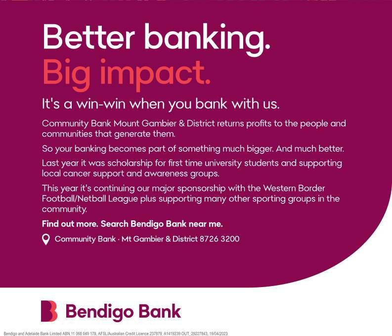 99 Jubilee Highway West, Mount Gambier SA 5290 Phone: (08) 8721 3400 www.barrymaney.com.au Sportswear, Casualwear, Workwear, Sports Equipment, Shoes, Trophies and So Much More 94 -96 Henty Street, Casterton phone 0437 683 052