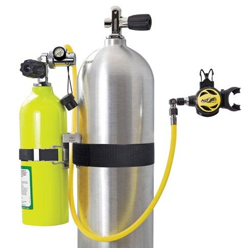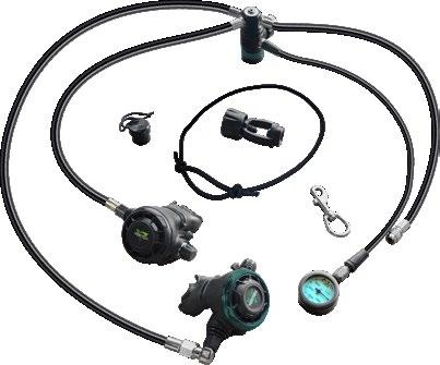 An alternate way for a sport diver to configure their regulator instead of using a yellow octopus at the end of a long, yellow hose. The streamlined set prevents hoses from dangling and optimizes comfort.