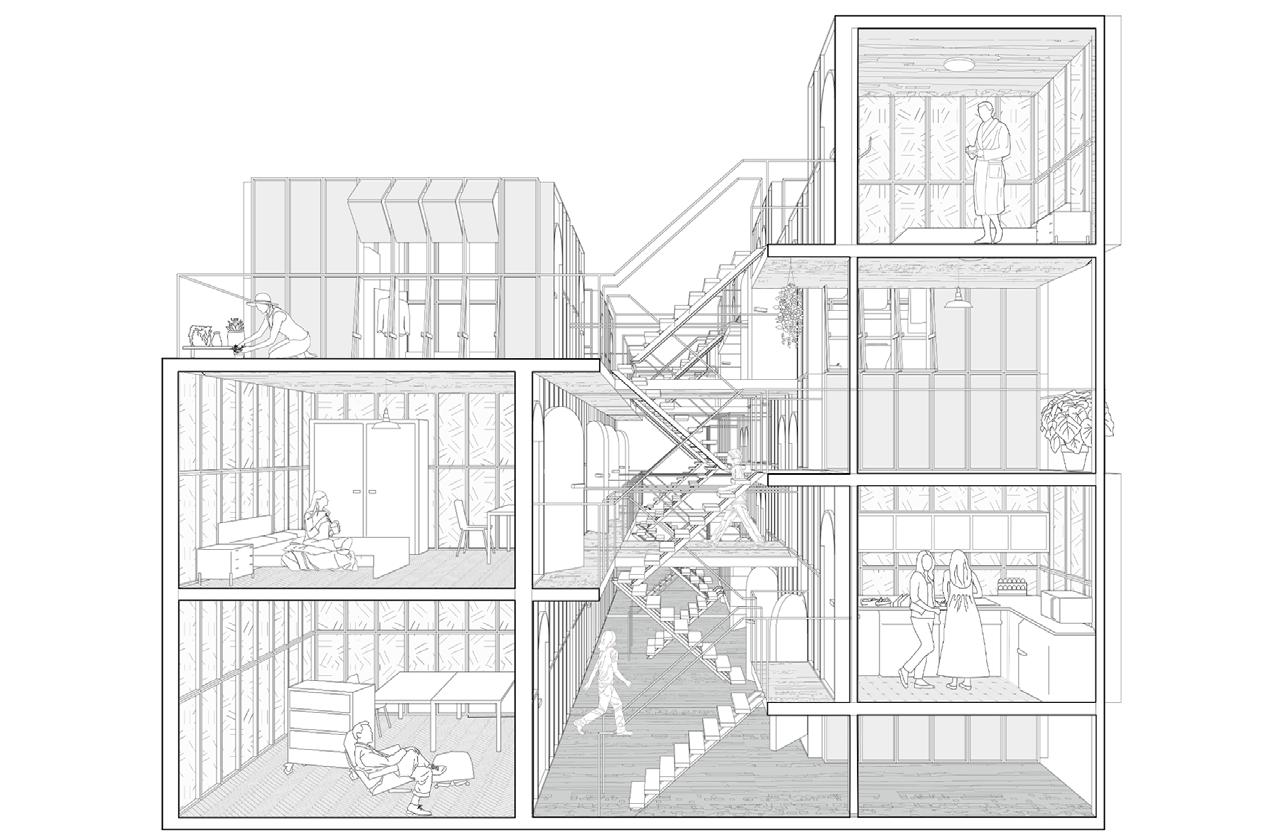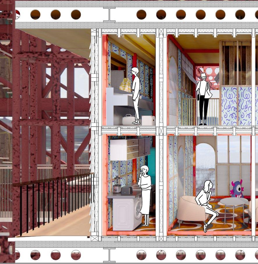 Architecturally, by including abundant communal space with different levels of privacy, translating the organic urban creative clusters into the vertical building typology, and designing a modular self-build housing and cladding system which allows co-living, this project aims to accommodate artists and their families with varying spatial requirements and remain an ecologically and economically sustainable building for over 100 years.