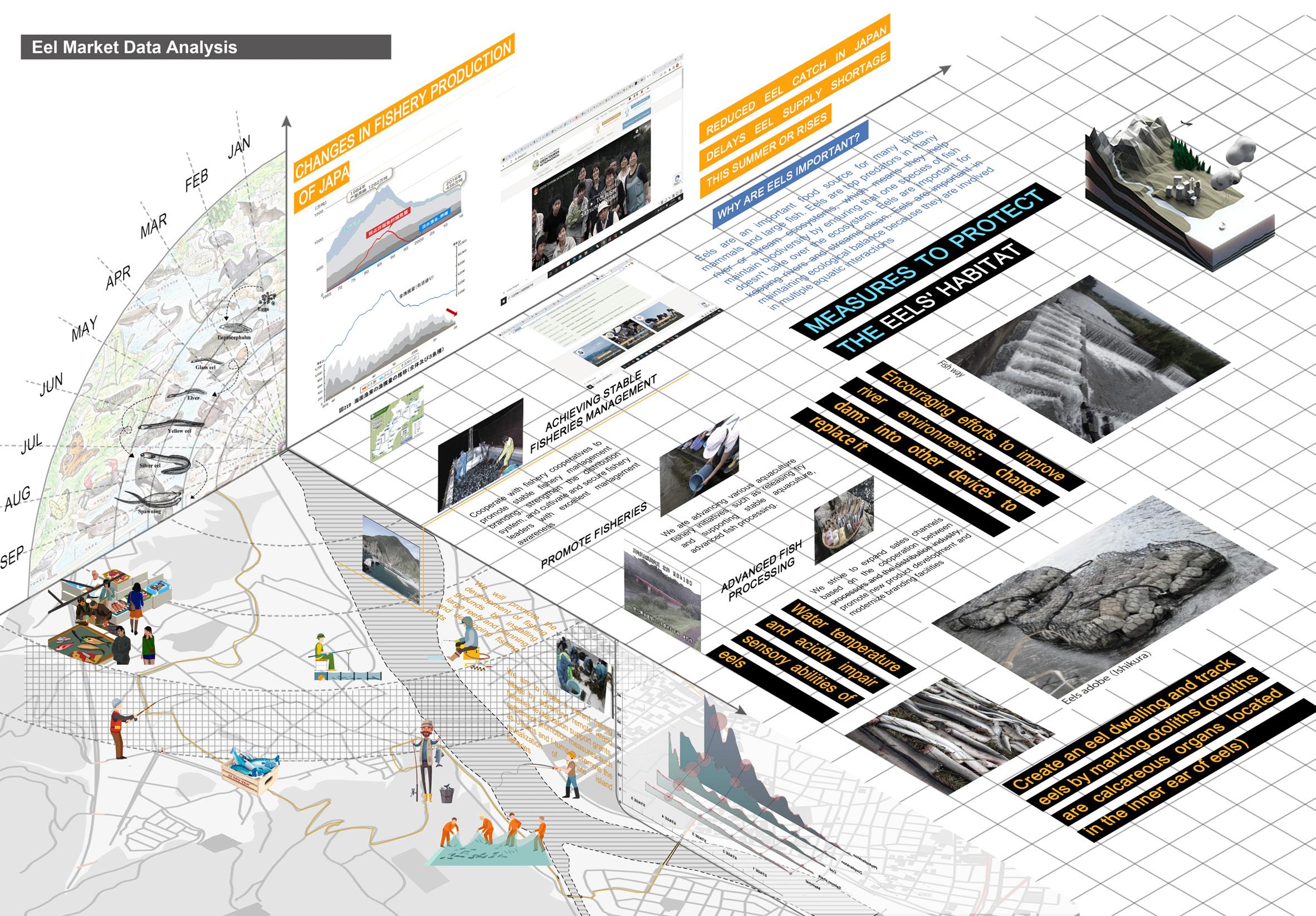 Can autonomous system potentially govern and supervise the eel industry to improve this condition? And what would such an architecture and infrastructure be required to do that? Our autonomous system, AEEB, is aim to achieve three goals: maintain ecological and economy policy, generate ,move or execute eel habitats when necessary, and finally fine or reward to particular shipping people. And it contains three main part: monitoring, producing, and implementing.
