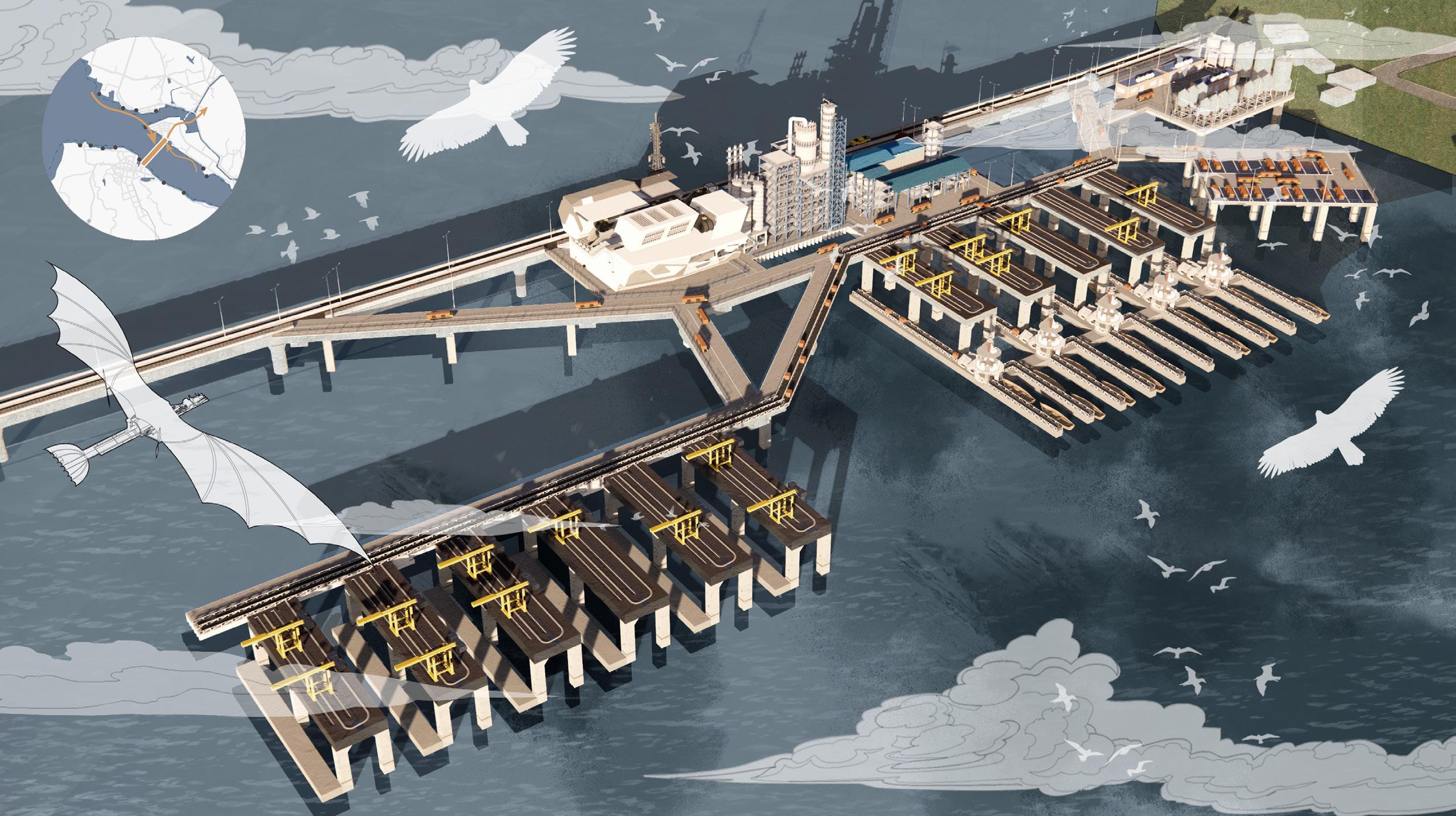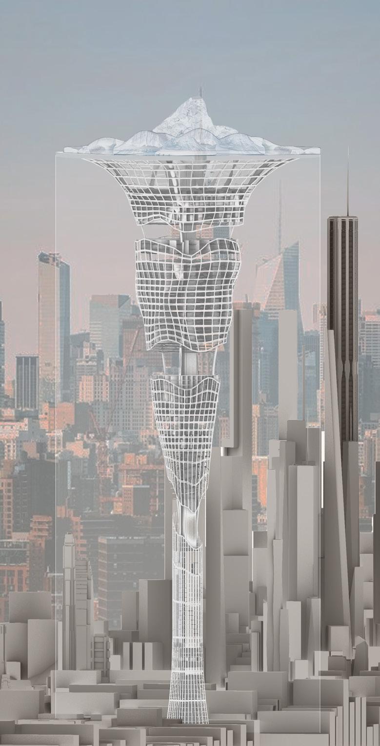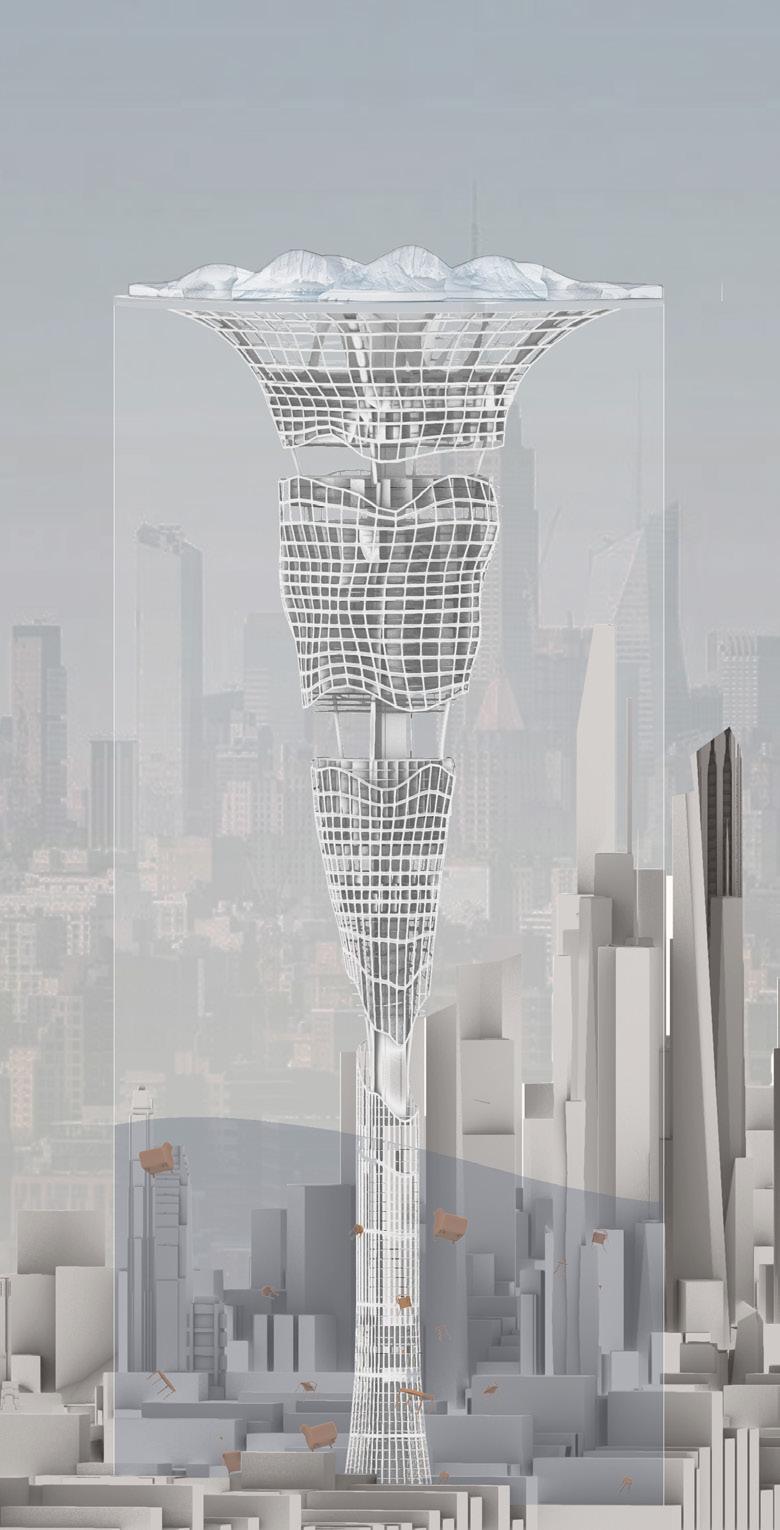 Our design aims to use striking tall buildings combined with icebergs to give a more visual representation of the phenomenon of rising temperatures in order to provoke thought and attention. As the temperature rises, the iceberg at the top of the building will gradually melt to reveal warning signs, while meltwater will be stored around the building. People will still be able to access the interior from the internal observation lifts, but the flooded parts will be unusable. As the water accumulates, more and more of the