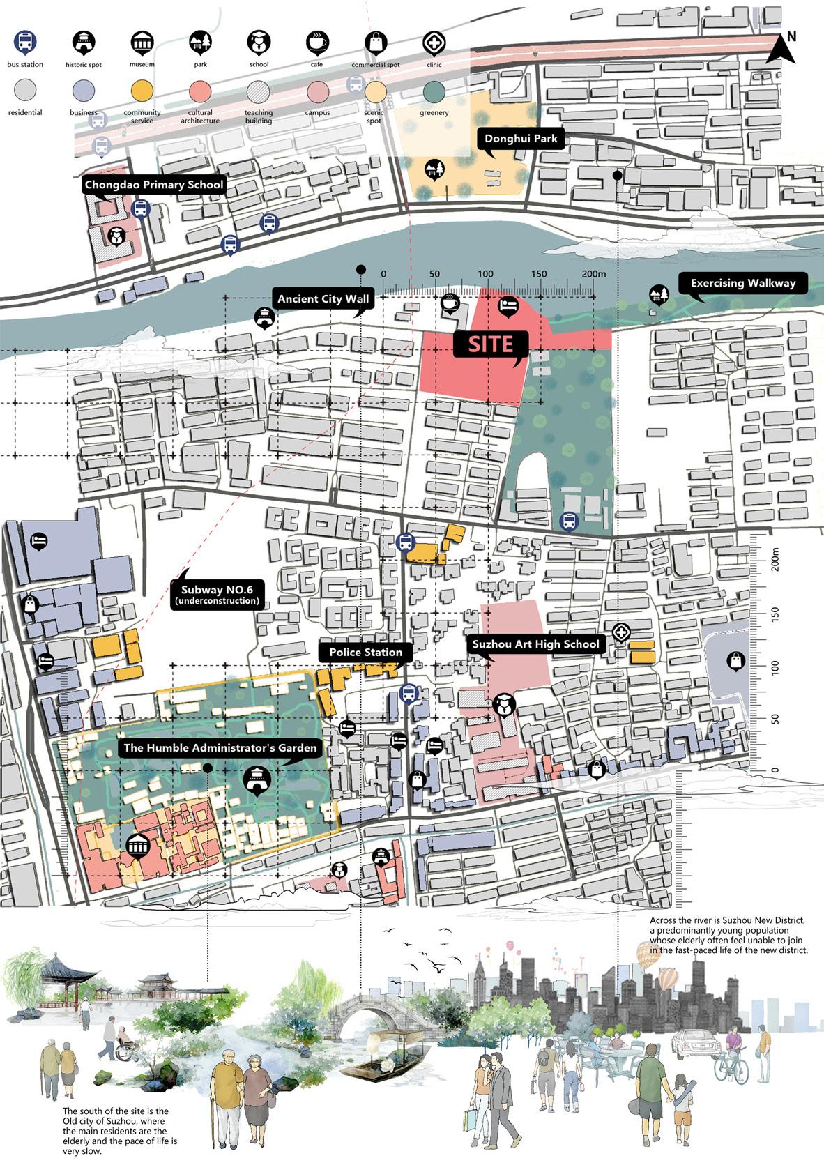 With the increasing ageing of China today and many elderly people not receiving the adequate care, it has become an important topic to make the elderly feel that they have not been abandoned by society. This project is located on the south bank of the Outer City River, at the junction of the old and new cities of Suzhou. The project is based on a voronoi cell design with dozens of living units, each cell is unique, so it is possible to create a living space tailored to the individual needs of each elderly person, from their health condition, to their quiet or active personality, to their daily eating and bathing habits. It also provides a great deal of outdoor space through the addition of a gently sloping artificial topography, making it fun for the elderly to exercise on a daily basis.