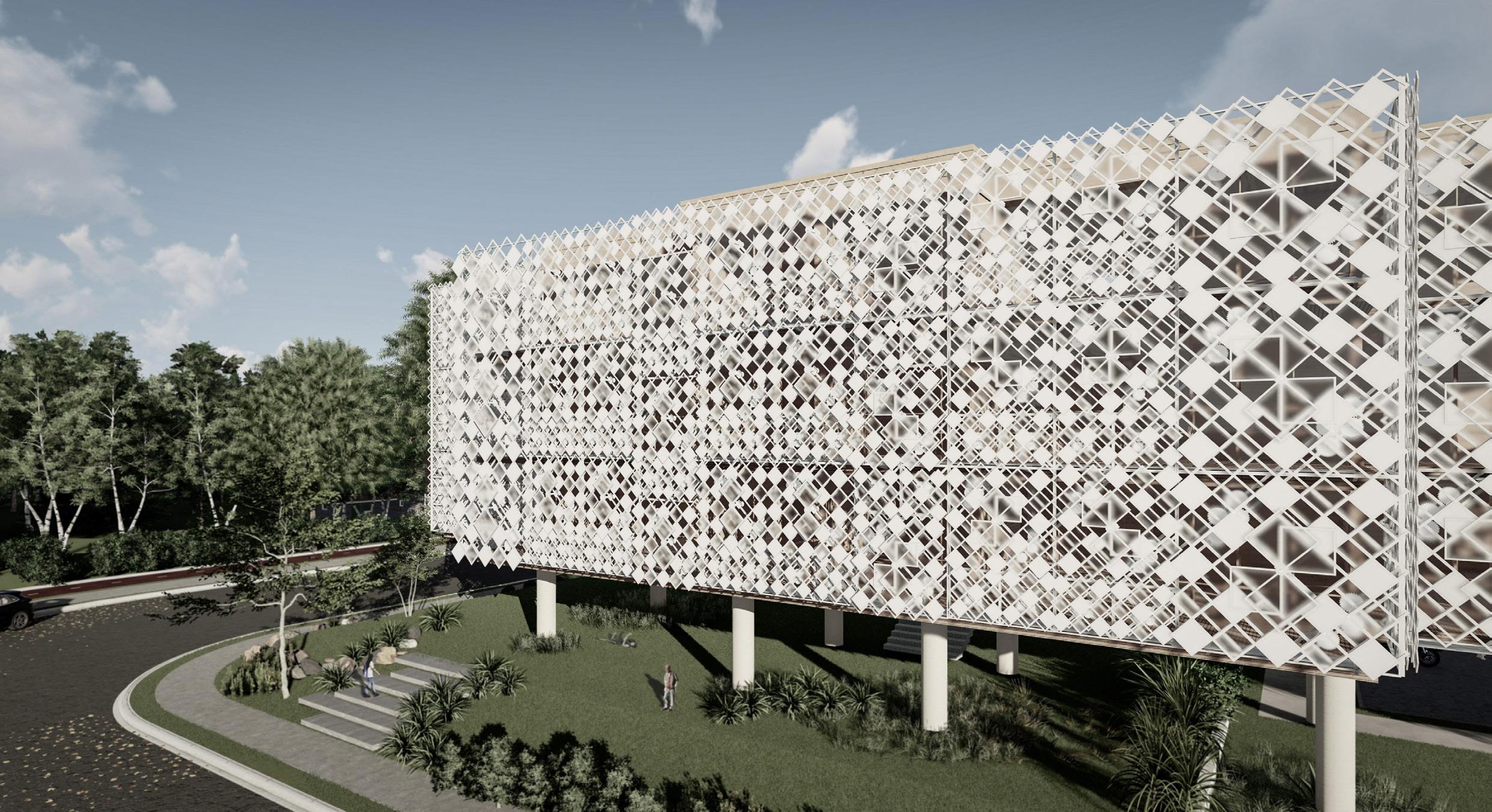 The grille kinetic facade is an envelop that responds to environmental changes. Inspired by kinetic sculpture, this facade regulates the amount of solar radiation ingress by varying the degree of overlap of the polycarbonate panels to make the building interior more comfortable. The core mechanical system of the facade is the gears, and the entire The facade is made up of three different kinds of units that can be operated by the user as required.