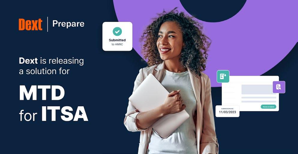 N DECEMBER 5 2022, THE FIRST RELEASE WILL BE AVAILABLE TO EXISTING DEXT PREPARE CUSTOM ERS AS PART OF THE DEXT PREPARE PROD UCT. IN EARLY 2023, WE WILL MAKE THE MTD ITSA SOLUTION AVAILA BLE TO THE WIDER MAR KET. DEXT’S SOLUTION WILL INCLUDE THE OP TION TO SUBMIT DIRECT LY TO HMRC ON BEHALF OF SELF-EMPLOYED AND LANDLORD CLIENTS.already know and trust Dext to deliver.