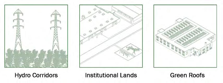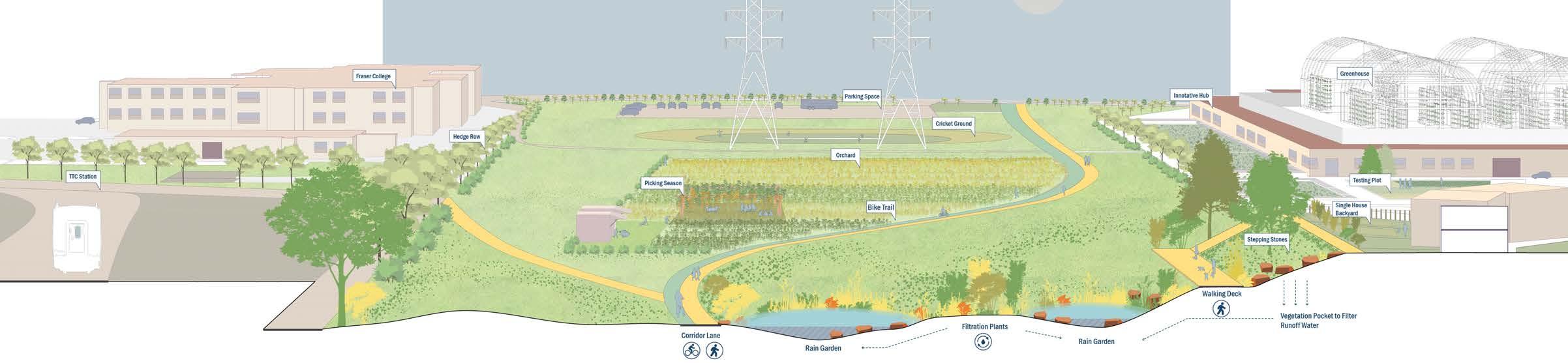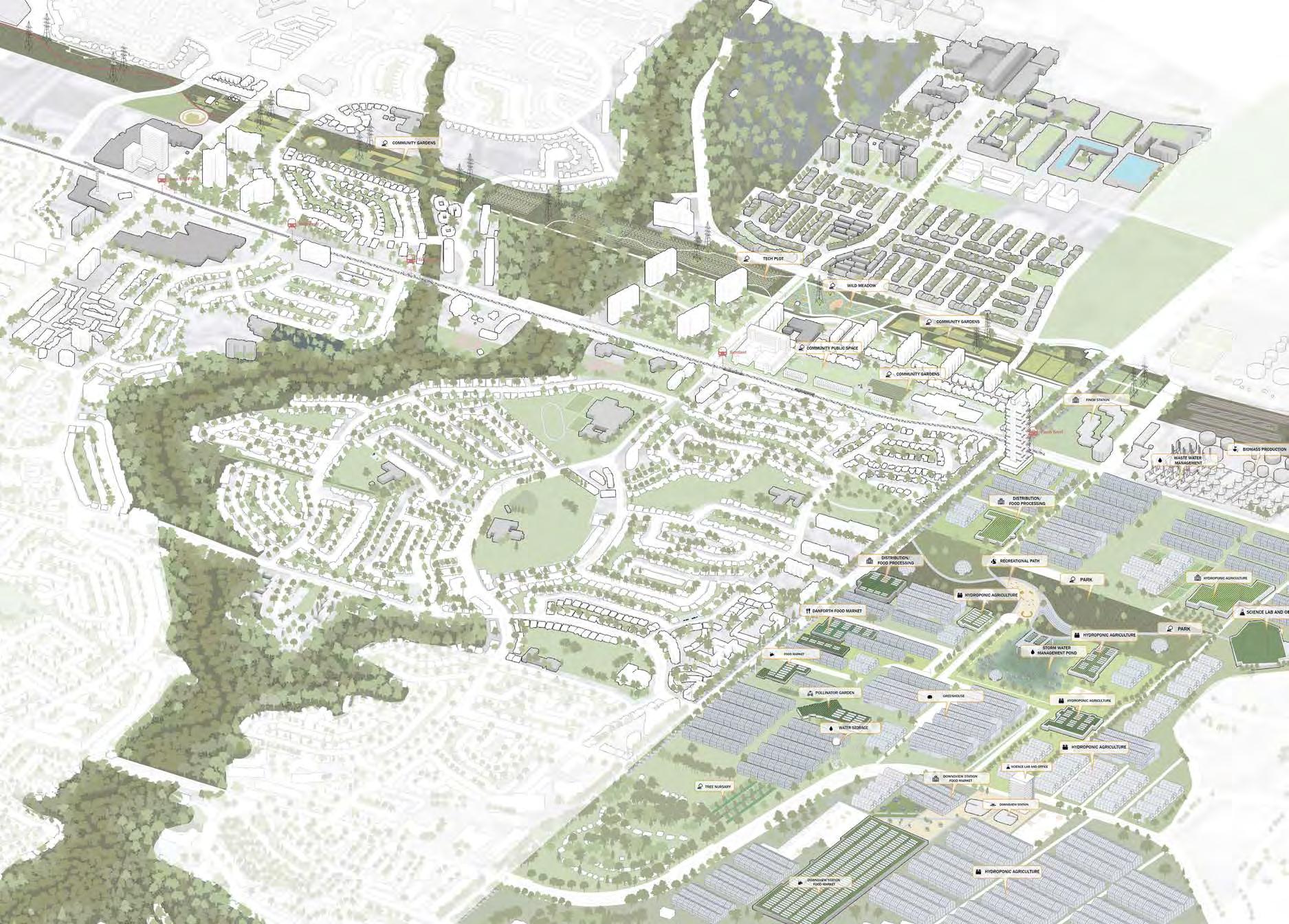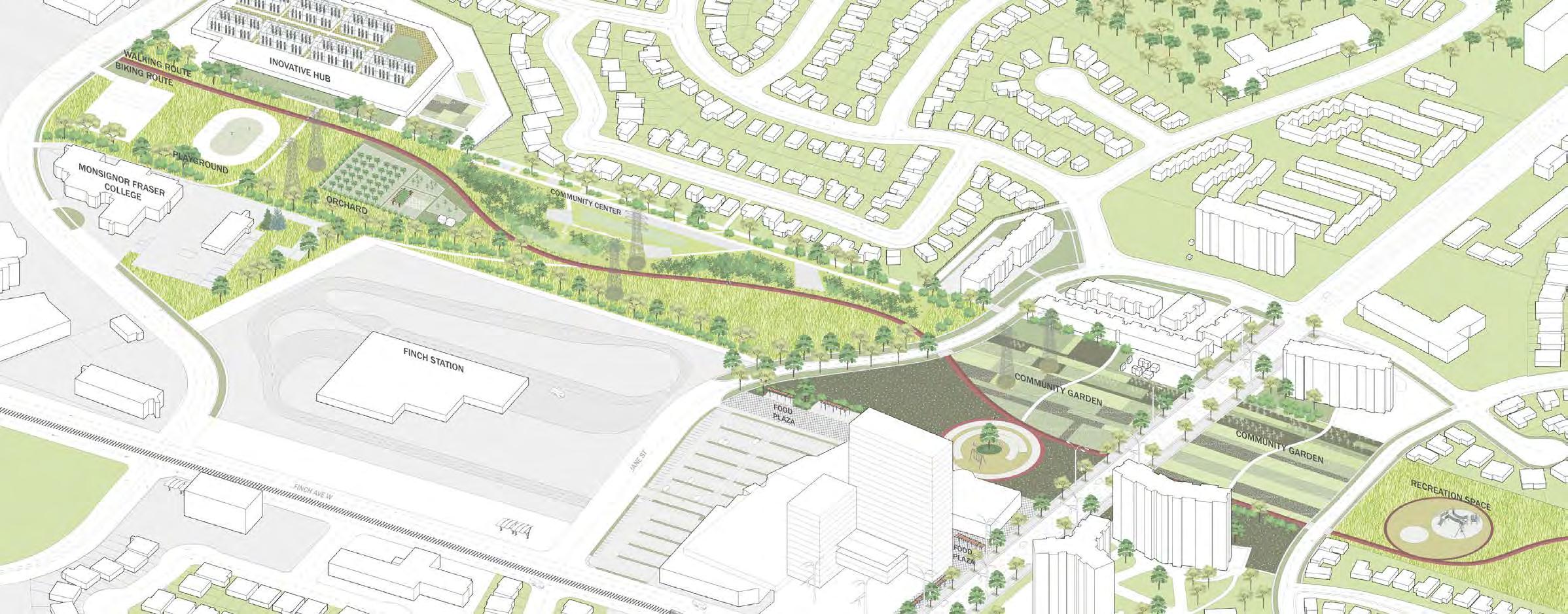 To address substantial spatial and social needs, our proposal suggests high-density indoor agricultural production within the existing employment areas and an interconnected web of community networks within the finch hydro corridor.