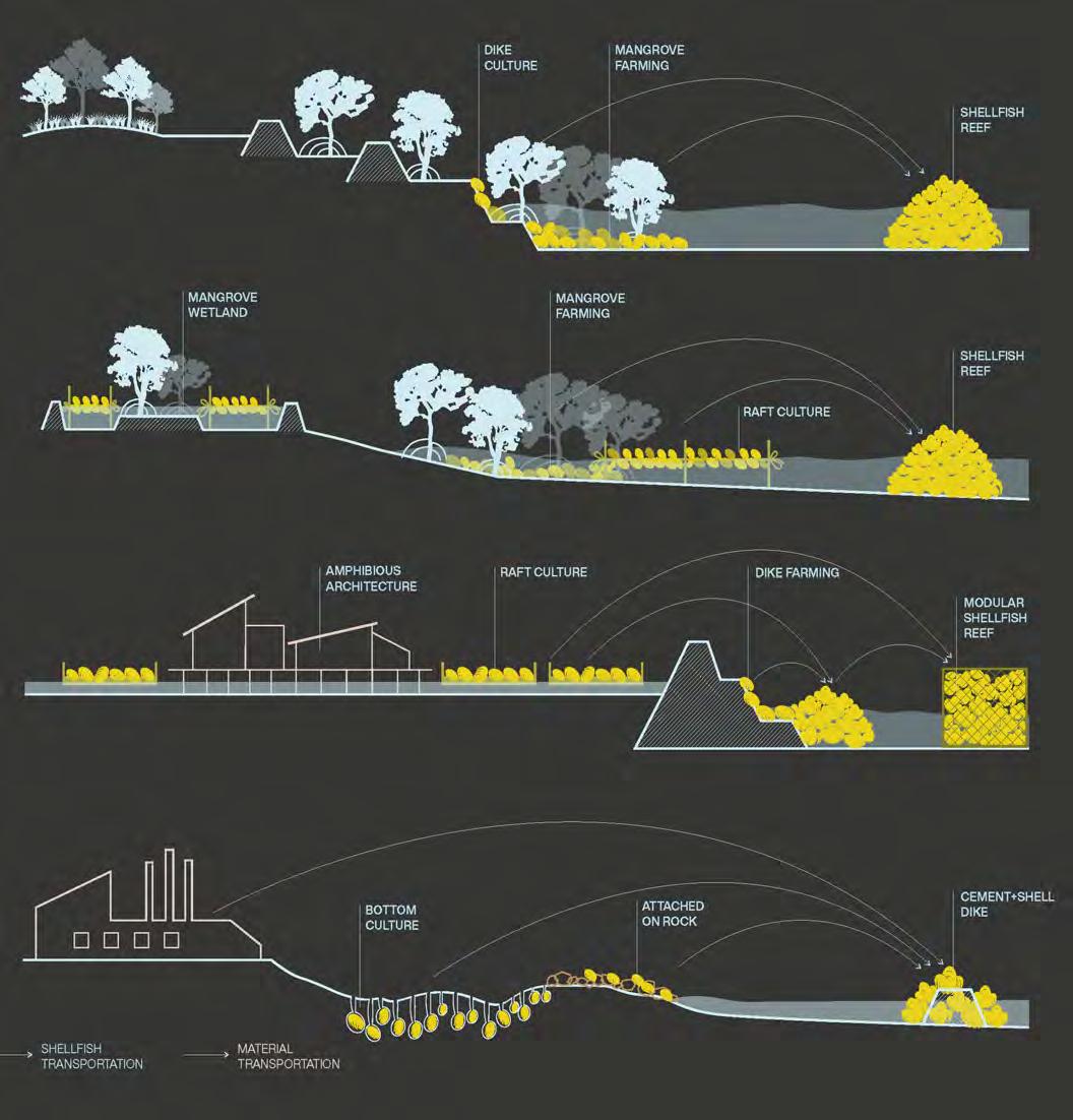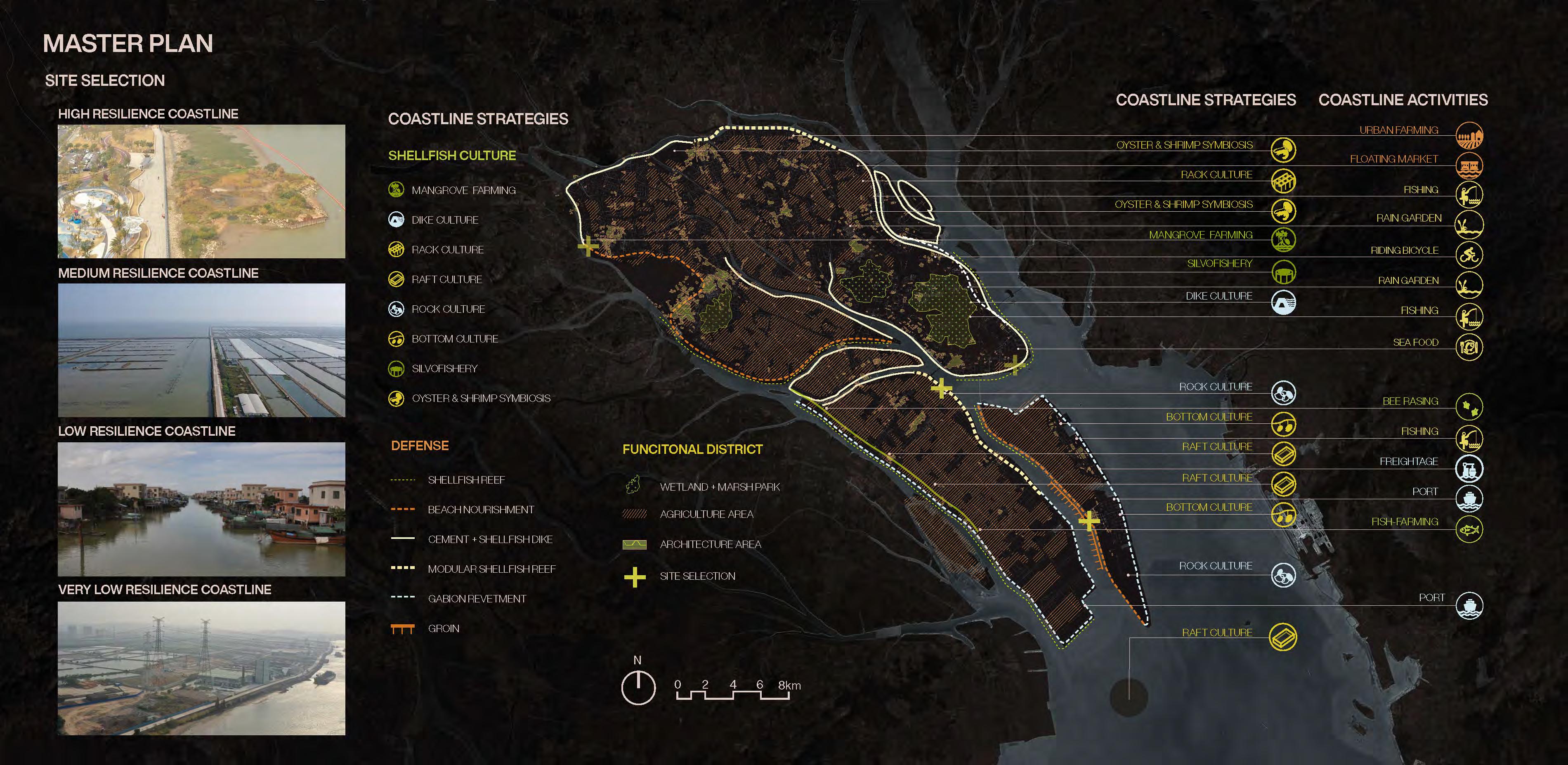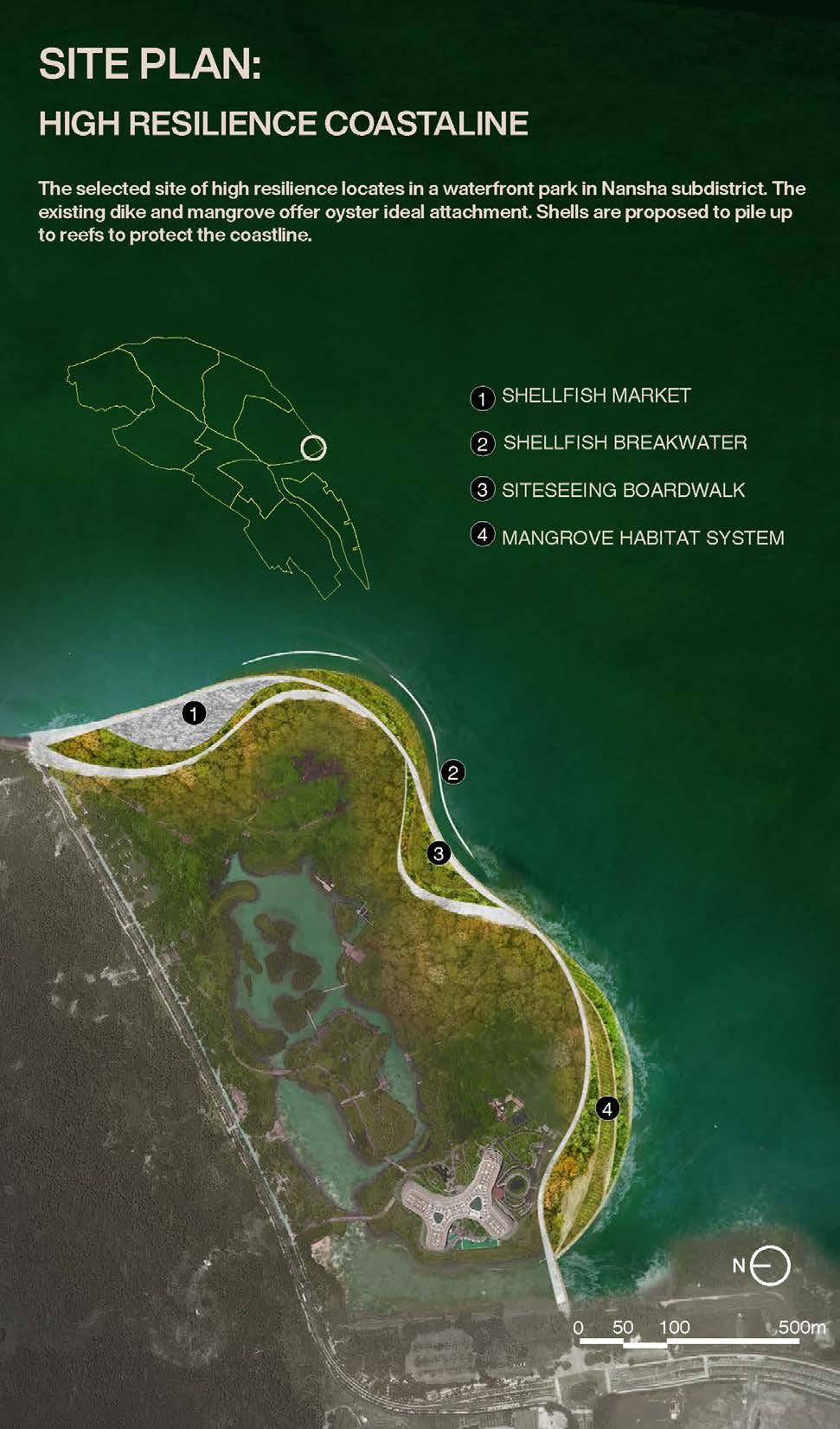 Nansha is one of the core cities in the center of Greater Bay Area. However, this coastal city is facing increasing risk due to climate change and rising seas. In response to coastal risk and urban expansion, the landscape architects envisioned Productive Defense that could combine the abundant native resources and adapt the city to climate change in future development. The original productive potential is fully realized along the coastline, catering for the need of a reliable coastal defense in Nansha. This proposal enlarges the area of agriculture while integrate defensive capability with agricultural production, enhances the recreational area by introducing productive programs, improves the adaptability in residential areas by providing a nourishing environment in future living zone, and shelters industrial areas by utilizing industial material to create productive buffers against coastal hazards.