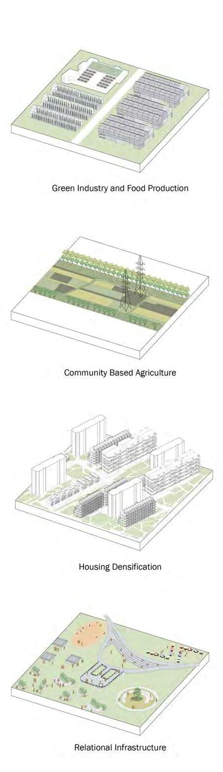 Considering connections between our site, existing residents, and food access, our strategic map identifies existing community hubs and social infrastructure that could be further developed, multiple employment areas that could be transformed into innovative green industries and several potential areas for high-density housing in conjunction with green industries and infrastructure.