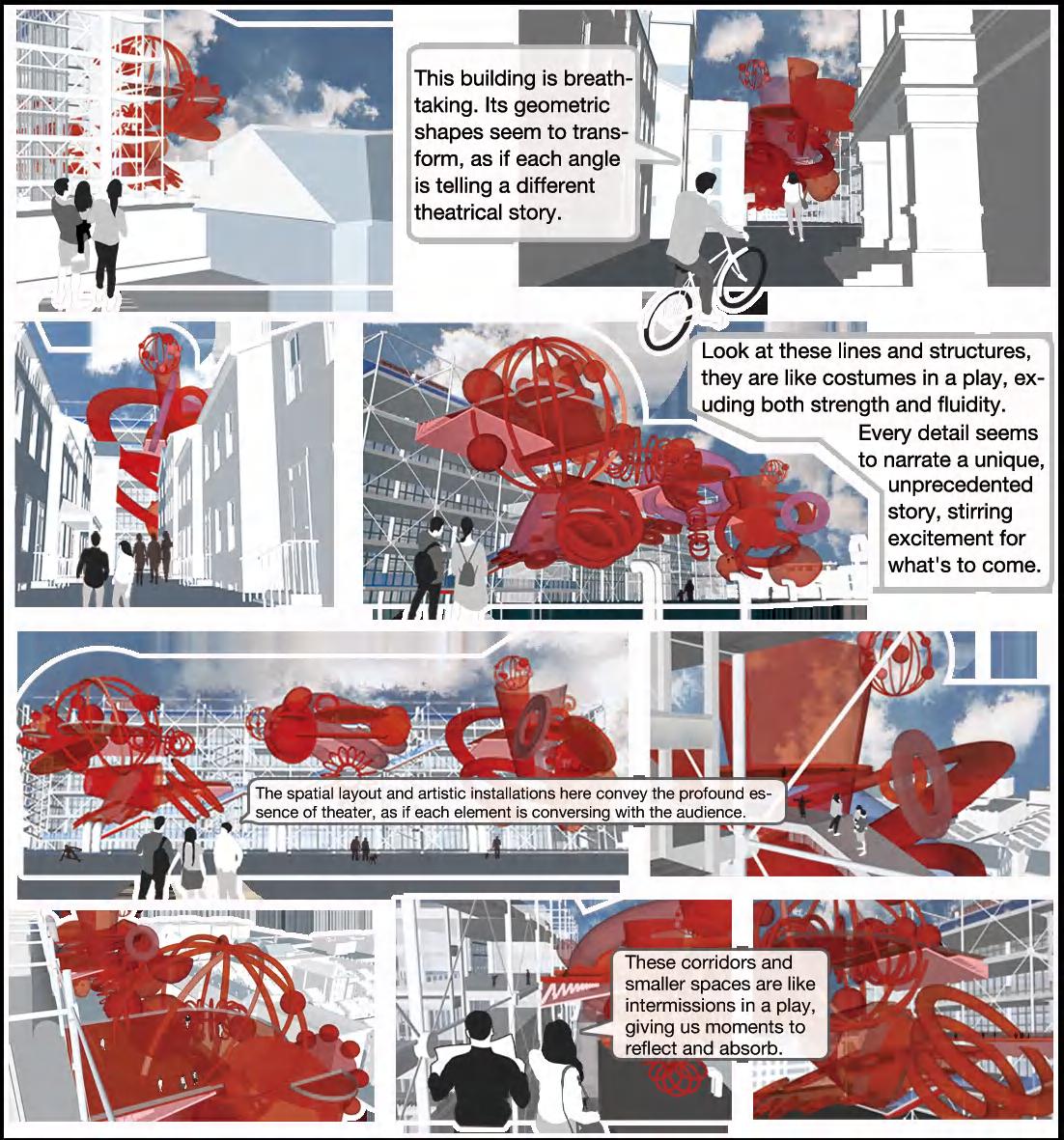 Inspired by Masashi Kawasaki's design, I am planning an exhibition of Jacques Offenbach's stage play Le Voyage dans la Lune at the Centre Pompidou. The exhibition space will be distributed on the Pompidou façade, aiming to give the audience a deeper understanding of the theatre through visual display. I have fused the fantastical elements of theatre with the modern architecture of the Pompidou to create a strong visual impact.