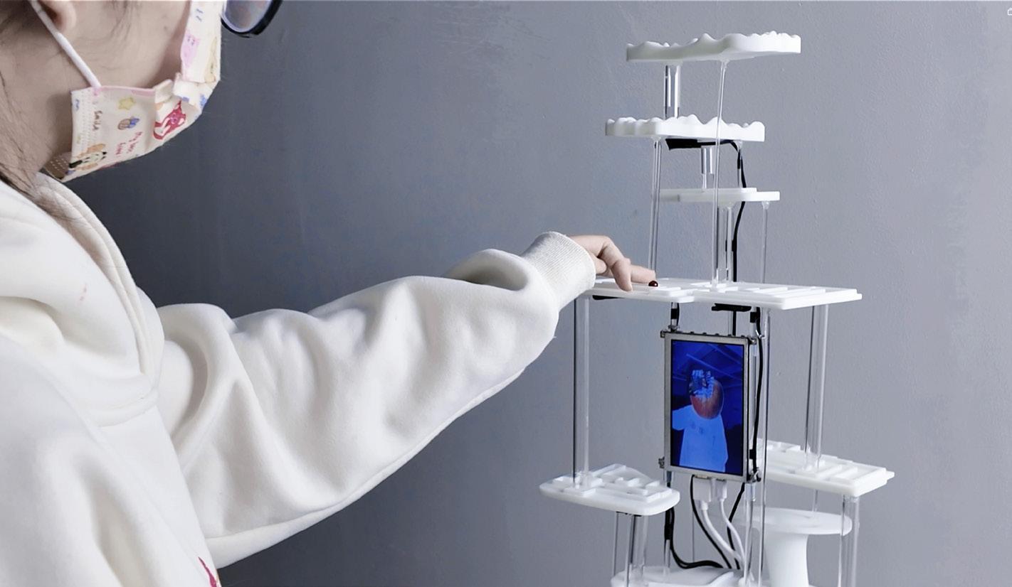 The use of infrared sensing beads to obtain stickers for different stages of life enables participants to gain a clear understanding of the process by which society shapes an individual's identity. Taking out the wrapped apple and tearing off the sticker at the end is to recognize the existence itself after actively tearing off the social label.