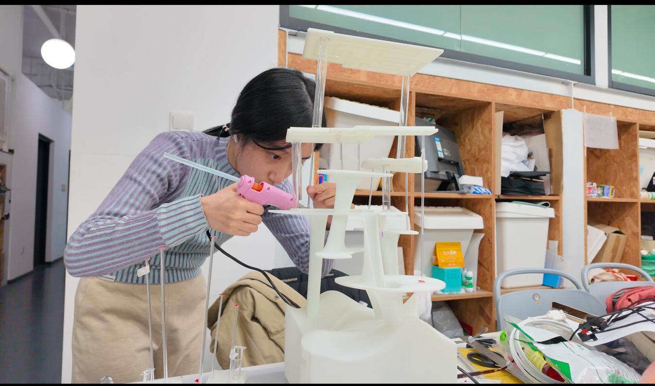Ancient bamboo furniture and contemporary steel buildings are used as inspiration to build the framework of the city, in which water, light and fabric are used to represent different angles of the city, which can be manipulated by human hands.