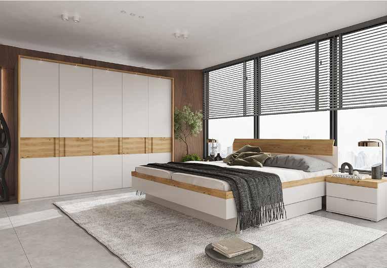 Spalnica , barva: siva/hrast. Venec omare z osvetlitvijo, vzmetnica in pod za doplačilo. Možnost izbire omar in postelj različnih dimenzij ter dodatkov. Omara, dim. 251,5 X 225 X 60 cm, 5 klasičnih vrat. Postelja, dim. 180 X 200 cm, vključno z osvetlitvijo. Nočna omarica, dim. 55 X 48 X 37 cm. Okrasni okvir z osvetlitvijo za omaro s petimi vrati: 339,- 249,- (00030096/08,01-07,09-28)