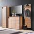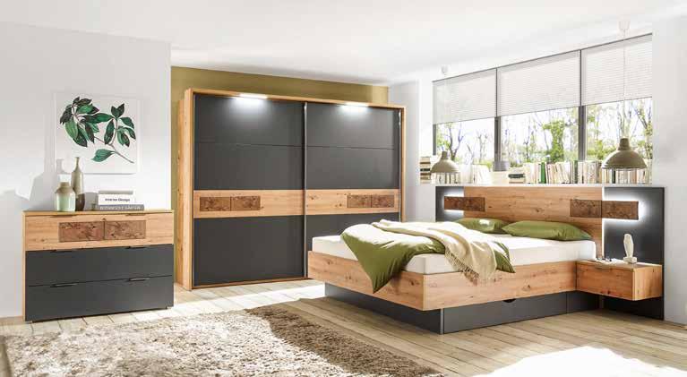 Spalnica , barva: dekor hrast artisan/grafit. Komoda, posteljna predala, vzmetnica in pod za doplačilo. Omara, dim. 250 X 215 X 63 cm, vključuje venec z osvetlitvijo. Postelja, dim. 180 X 200 cm, vključuje nočni omarici in LED-osvetlitev. Komoda, dim. 120 X 90 X 38 cm. Set 2 posteljnih predalov: 229,- 149,-. Omara, dim. 280 X 215 X 63 cm: 1.119,- 739,- (25220312/07,02-04,06,11)