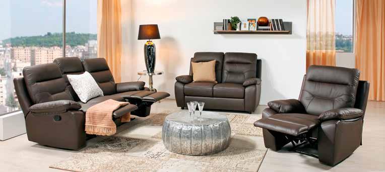 Sedežna garnitura , sestavljena iz troseda, dim. 198 X 92 X 102 cm, z dvema funkcijama relaks in dvoseda, dim. 145 X 92 X 102 cm. Barva: temno rjava, sedišče v usnju, hrbtni del tekstil v videzu usnja. Okrasne blazine niso vključene v ceno. Počivalnik, dim 90 X 92 X 102 cm, v temno rjavi barvi, sedišče v usnju, hrbtni del tekstil v videzu usnja, s funkcijo relaks. (06650001/01-02)