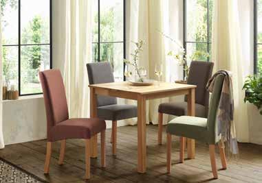Jedilna miza , dim. 80 X 75 X 80 cm. Masivna jedrna bukev, oljena. Stol, blago zelene, sive, orehove ali rdeče barve, noge masivna bukev. (27480017/01;10130036/01-04)