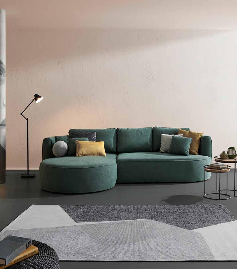 Sedežna garnitura , dim. 183 X 284 cm, v tkanini zelene barve. Vključno s posteljno funkcijo in predalom za shranjevanje. Možnost doplačila za okrasne blazine: 89,90 74,90. Možnost leve ali desne postavitve. (23070209/03-04)