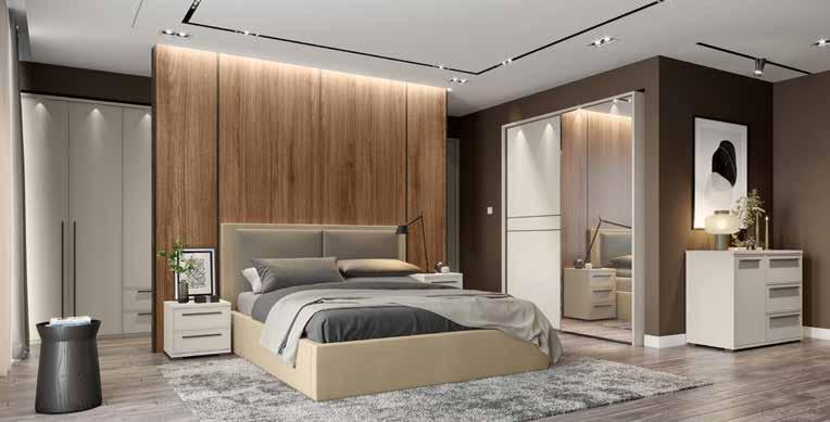 Spalnica , barva kašmir. Možnost naročila omar različnih dimenzij, dodatkov ter postelje v dim. 160 X 200 cm. Osvetlitev, venec omare in vzmetnica za doplačilo. Omara, dim. 230 X 224 X 61 cm. Nočna omarica, dim. 45 X 43 X 40 cm. Komoda, dim. 107 X 85 X 45 cm. Oblazinjena postelja, brez vzmetnice, dim. 180 X 200 cm. (001C0004/86,1B,85,88,91-92,96)