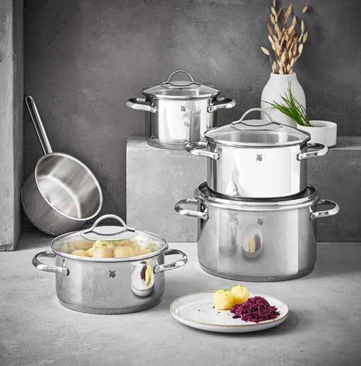 4: Set posod „FUNCTION“, 9/1, izdelan iz kakovostnega nerjavečega jekla Cromargan®, s transtermičnim dnom. Set vsebuje pet posod različnih premerov in kapacitet ter štiri pokrove. Posode imajo toplotno izolirane ročaje, na pokrovu pa silikonsko tesnilo. Primeren za vse toplotne vire, tudi