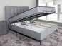 Oblazinjena postelja , dim. 160 X 200 cm v svetlo sivi barvi, ogrodje masiven les, noge lesene, vključno z zabojem za posteljnino. Prešita vzmetnica z žepkastim vzmetnim jedrom, tekstil vzglavja, podnožja in vzmetnice prešit s PES vlakni. Možnost izbire različnih dimenzij in barv blaga oblazinjenja. Nočna omarica za doplačilo. Dim. 180 X 200 cm: 1.369,- 1.020,- (20150043/17-18)