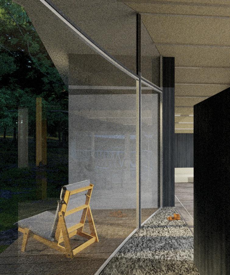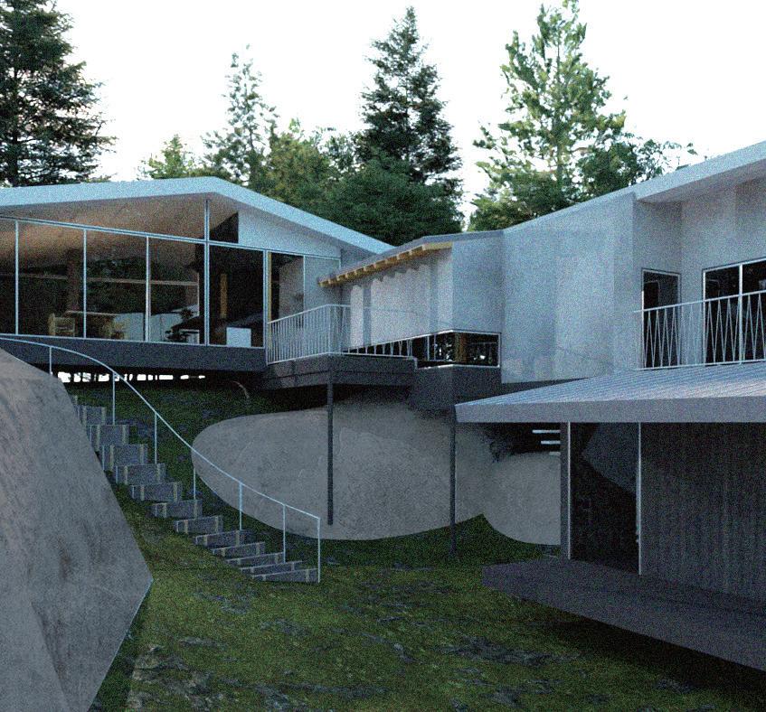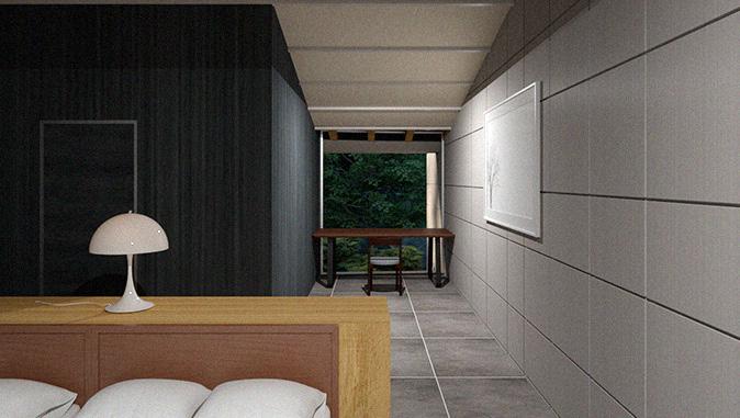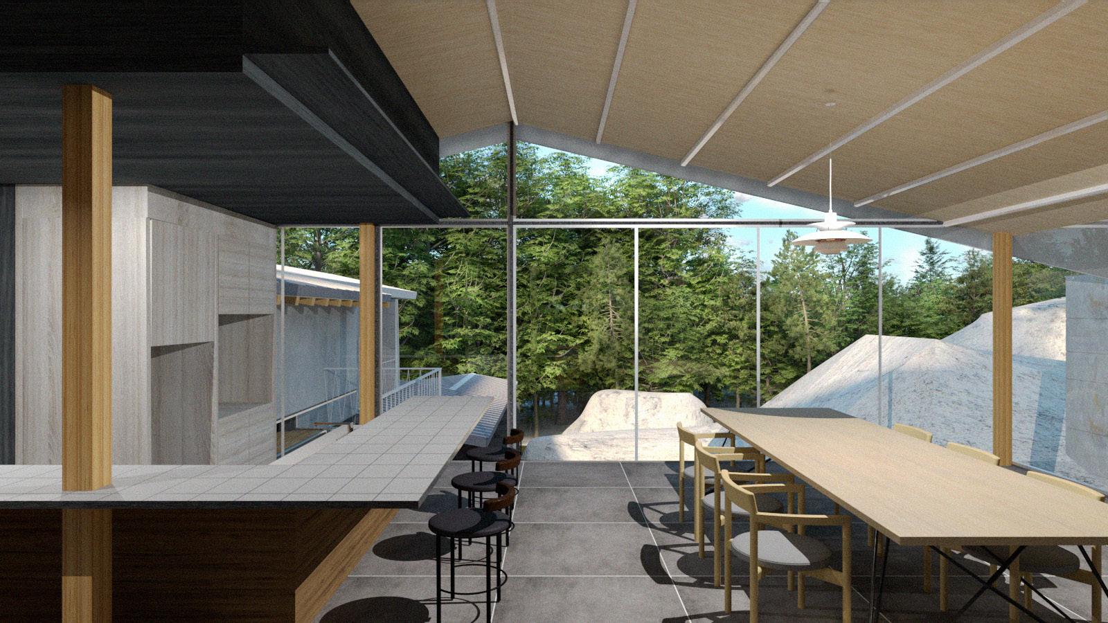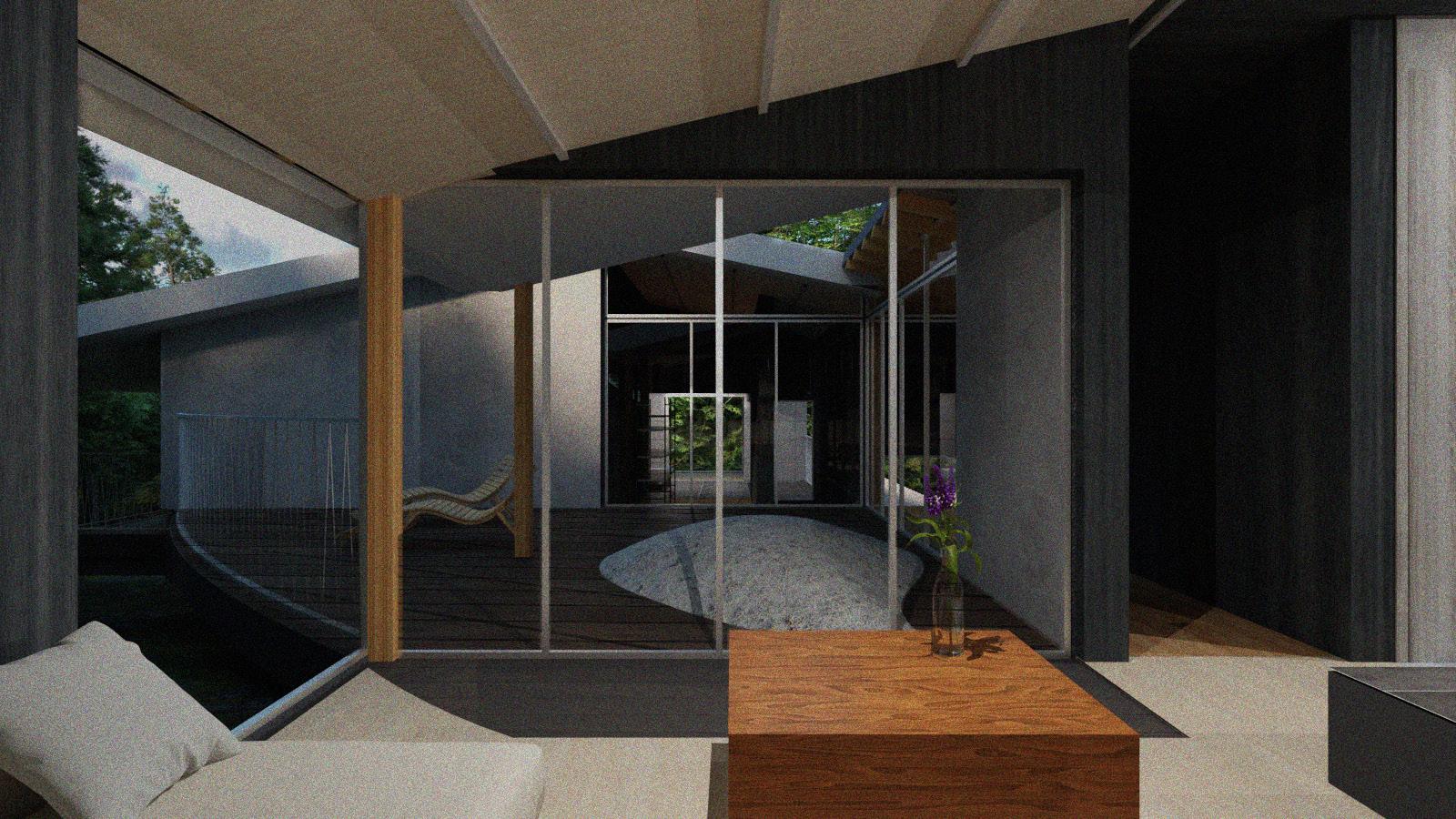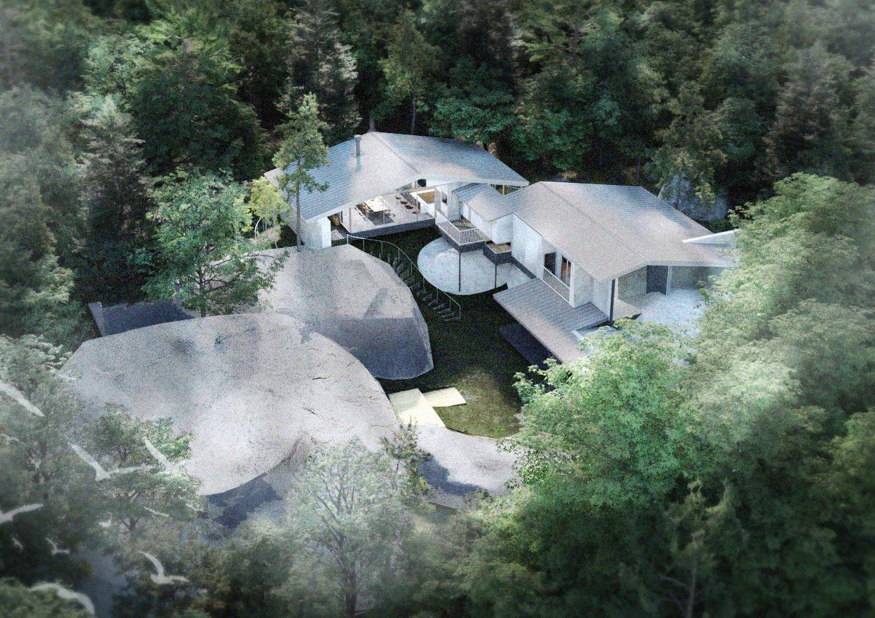 自然と時との対話の中で、北軽井沢特有の流れを体験できる建築を提案する。地形と建築の調和を つくるために、既存の岩の配置から広がりのある螺旋を見出し、この土地にある潜在的な美しさを 顕在化させる。その軸性は、訪れる人を〈体験のながれ〉へと導く。 ここにしかない〈体験のながれ〉をつくる