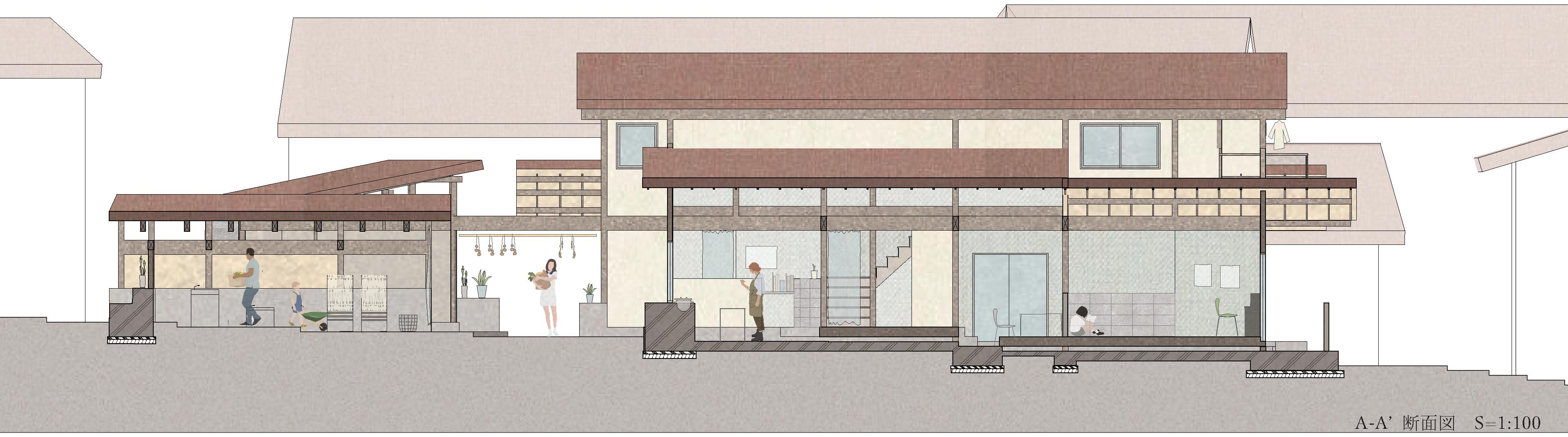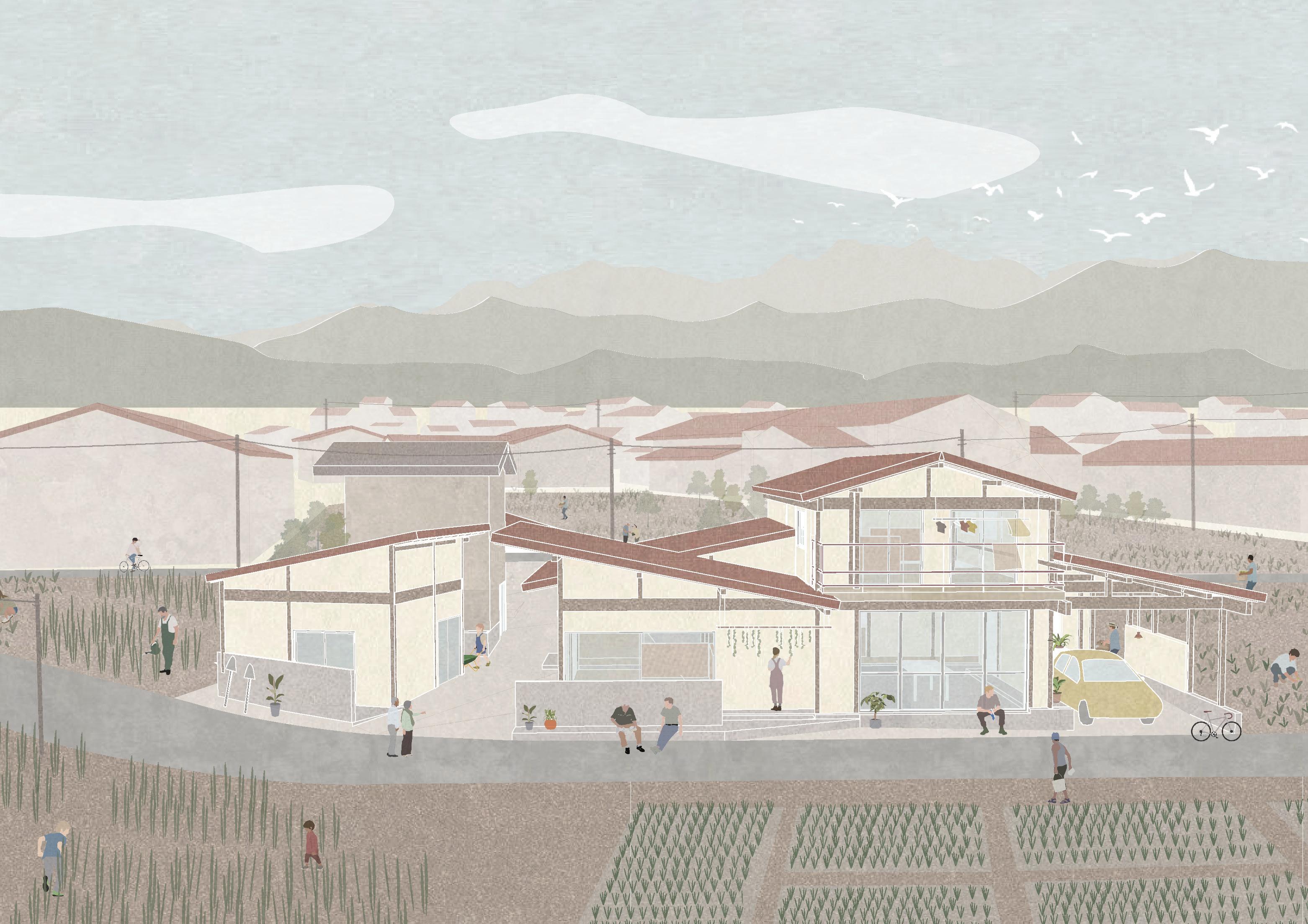 集落特有の風景を作り上げる。敷地はある集落の外周部に 位置し、この住宅は集落の新たなファサードとなる。