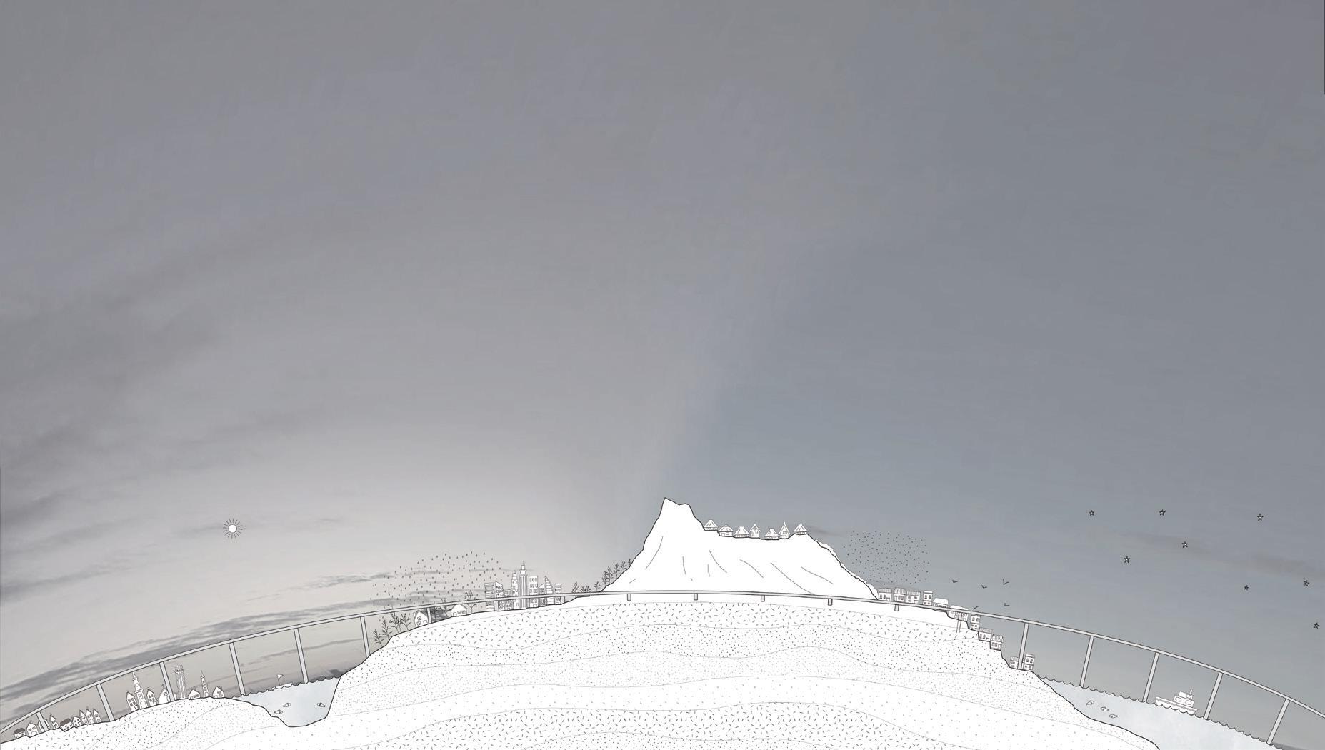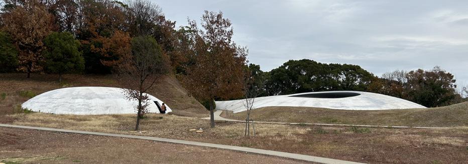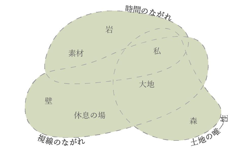体験のながれを意識した配置計画と、新しい岩となる空間とその構成要素。今ある大地と新しい建 築とのはざまをめぐりながら、唯一の空間体験や周辺との呼応に生まれる一連の物語(シークエン ス)をつくる。 今ある地形と新しい岩の間に生まれる体験と風景