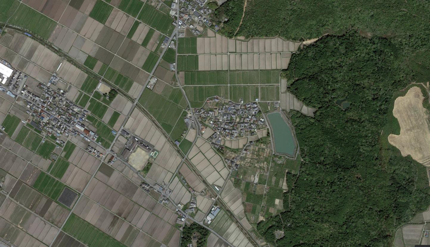 滋賀県愛荘町は田畑の中に島状の集落が多く存在している。